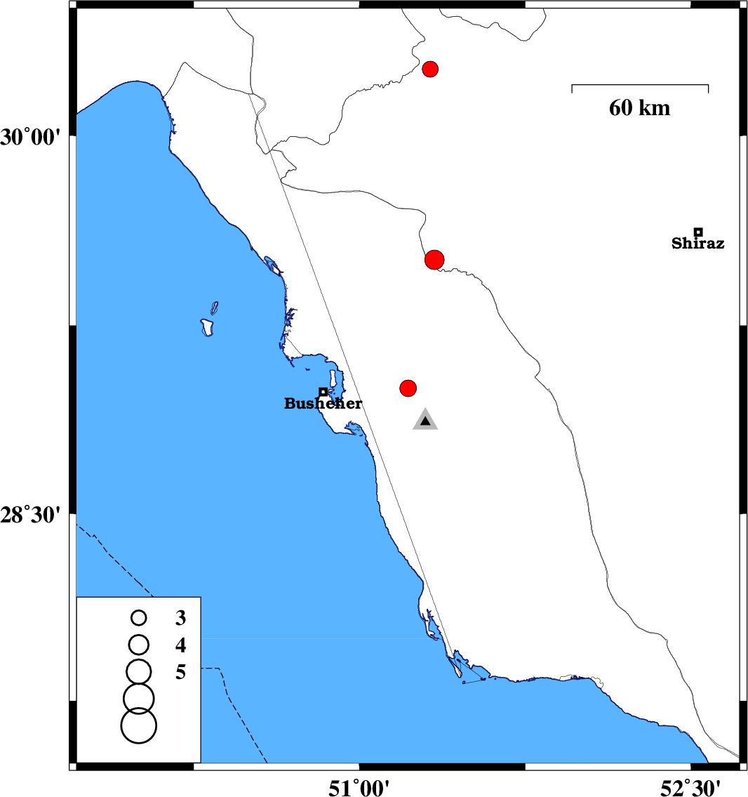 2009/08/15 | 01:46:42.6 | 06:16:42.6 | 29 | 51.22 | 15 | ML:3.4 | Bushehr Province, 14 km North of Ahram | ||