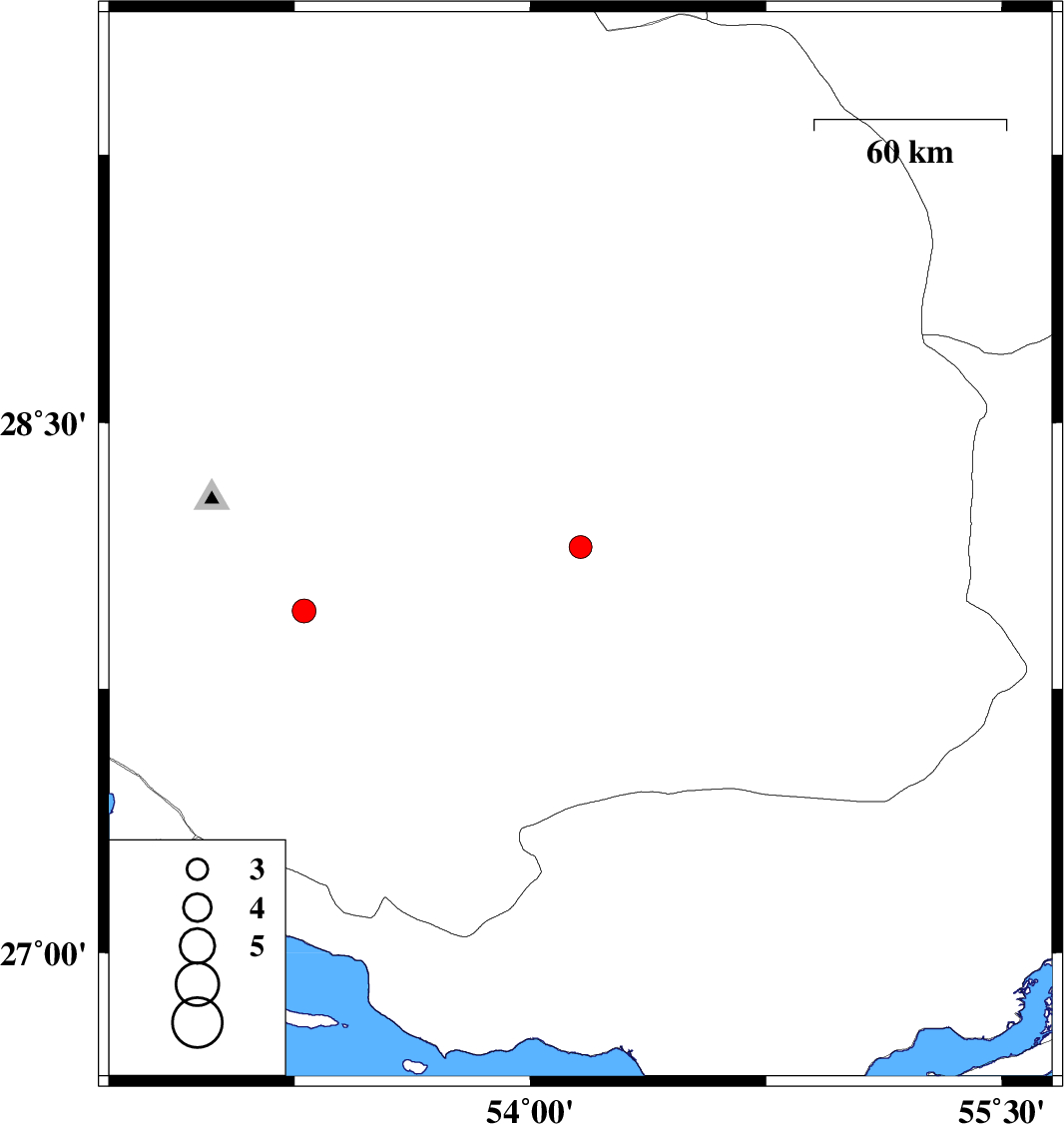 2009/08/12 | 07:18:23.1 | 11:48:23.1 | 27.97 | 53.28 | 14 | ML:3.4 | Fars Province, 60 km South-East of Qir va Karzin |