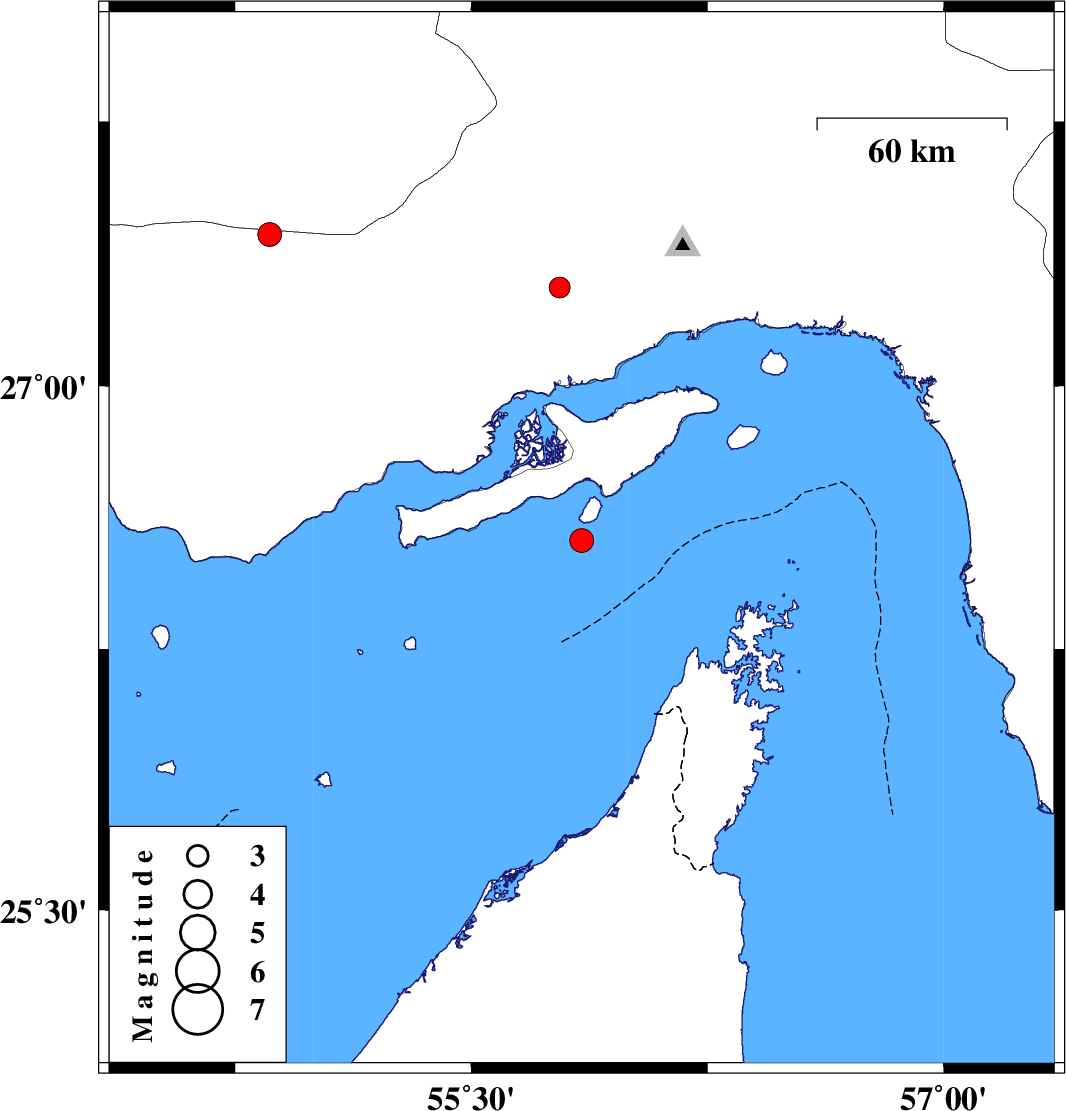 2009/08/29 | 01:40:30.5 | 06:10:30.5 | 26.56 | 55.85 | 8 | ML:3.4 | Persian Gulf, 60 km South-West of Qeshm | ||