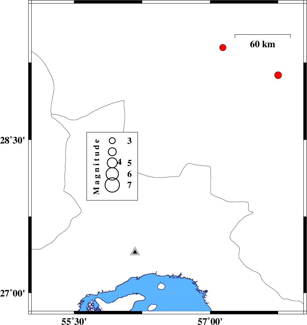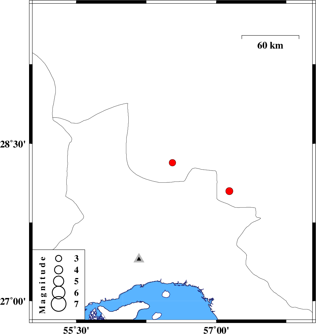 2009/09/15 | 14:44:10.4 | 19:14:10.4 | 28.05 | 57.14 | 27 | ML:3.5 | Kerman Province, 55 km West of Kahnuj |