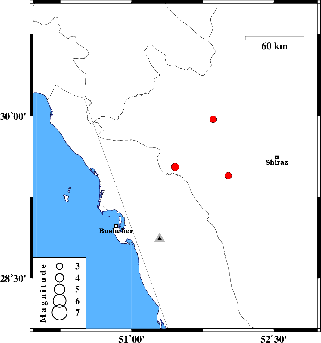 2009/09/22 | 06:33:42.9 | 10:03:42.9 | 29.45 | 52.02 | 15 | ML:3.2 | Fars Province, 40 km South-East of Kazerun |