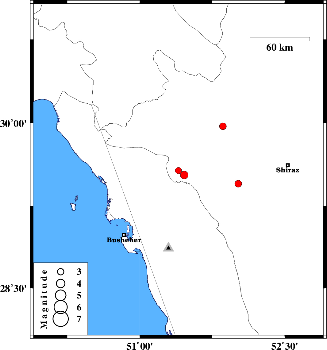 2009/09/28 | 23:27:05.6 | 02:57:05.6 | 29.57 | 51.4 | 18 | ML:3 | Fars Province, 25 km West of Kazerun | ||