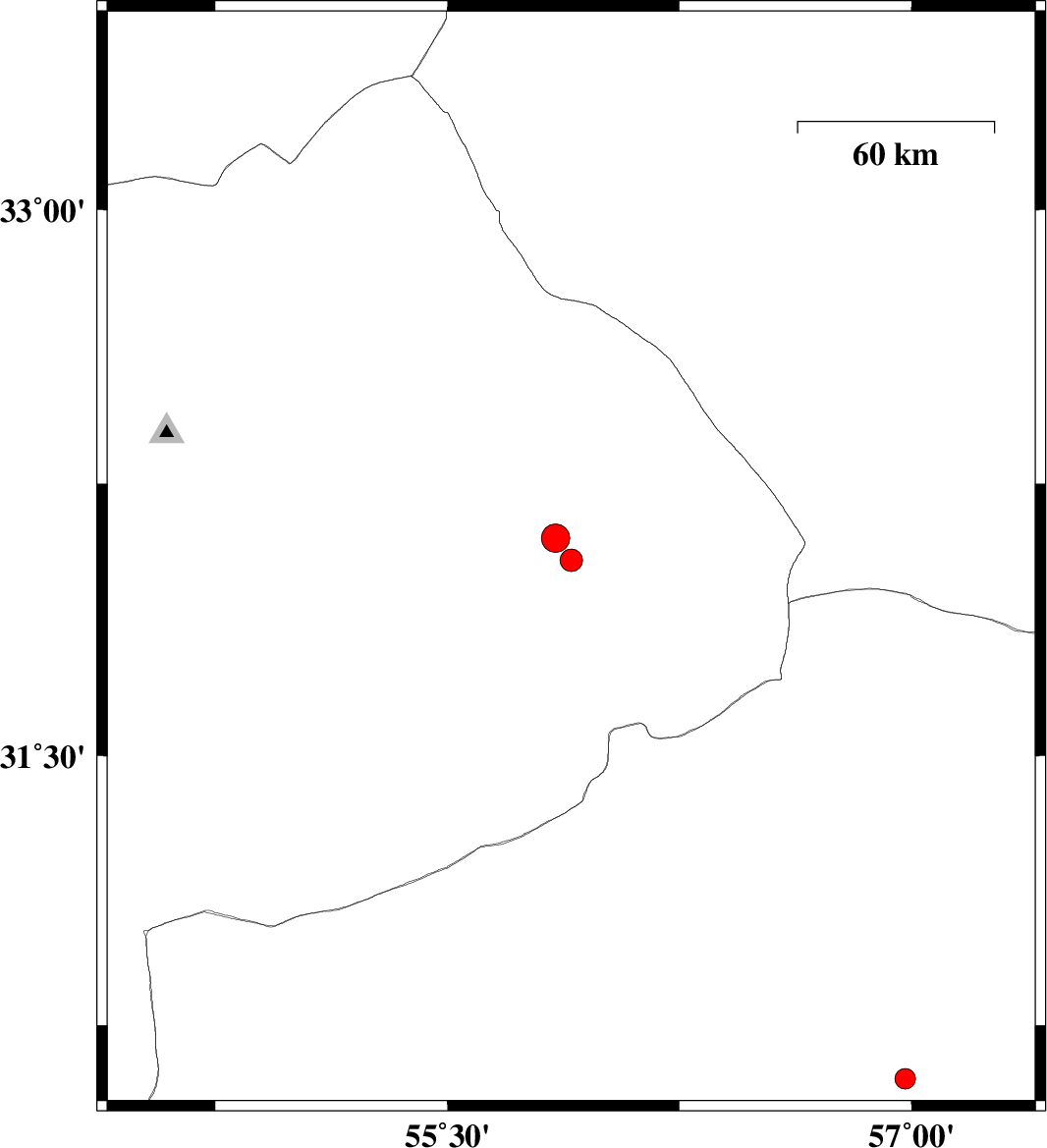 2009/09/30 | 00:12:01.1 | 03:42:01.1 | 32.04 | 55.9 | 15 | ML:3.3 | Yazd Province, 68 km North-East of Bafq | ||