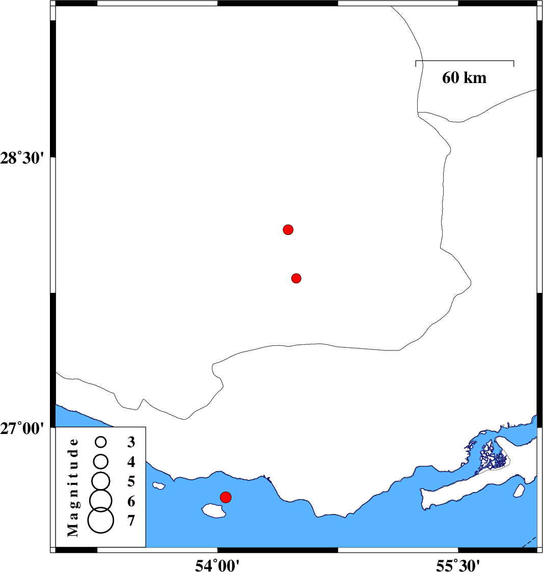 2009/09/27 | 06:20:05.6 | 09:50:05.6 | 28.1 | 54.44 | 7 | ML:2.8 | Fars Province, 48 km North of Lar |