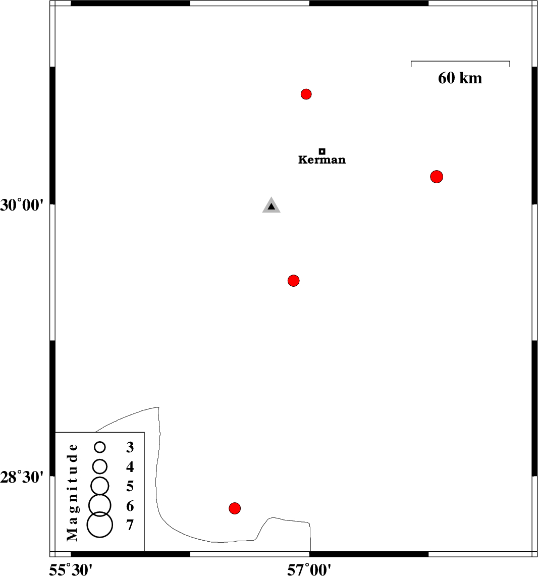 2009/09/29 | 21:37:52.5 | 01:07:52.5 | 30.6 | 56.98 | 14 | ML:2.9 | Kerman Province, 35 km North of Kerman | ||