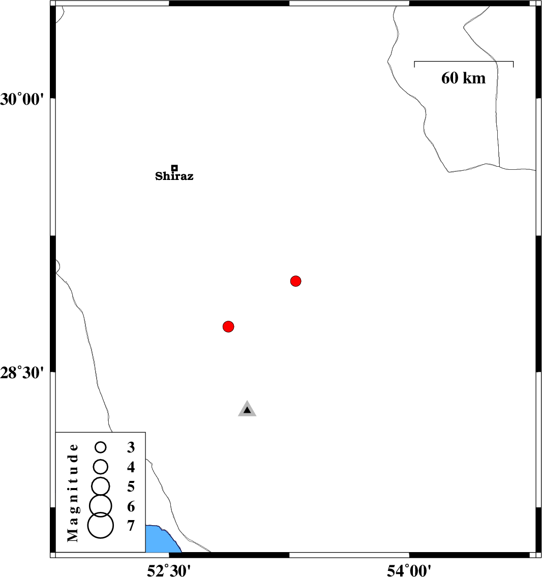 2009/10/10 | 12:18:06.2 | 15:48:06.2 | 29 | 53.29 | 37 | ML:2.9 | Fars Province, 35 km West of Fasa | ||