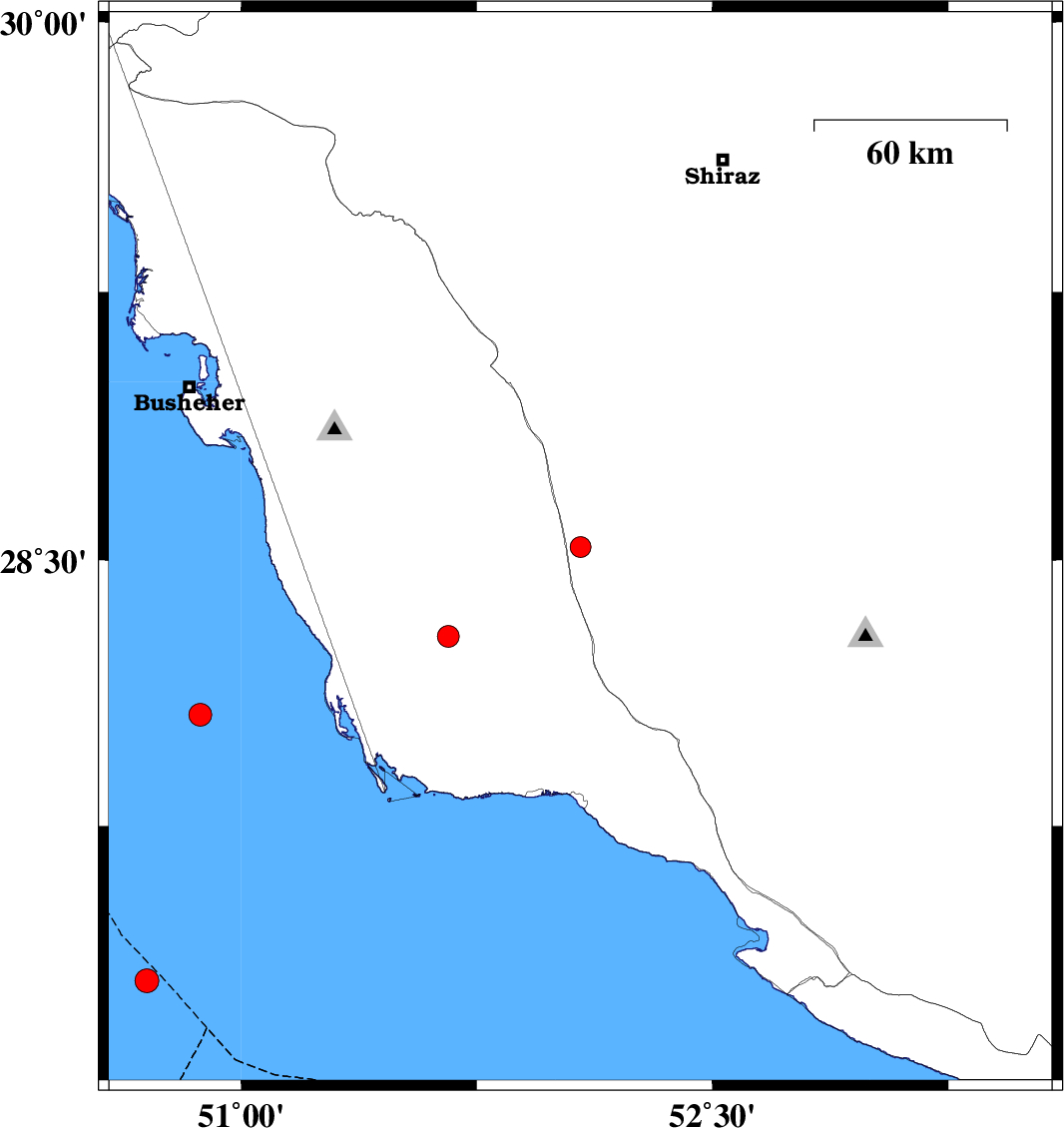 2009/10/09 | 19:14:42.1 | 22:44:42.1 | 27.78 | 51.91 | 15 | ML:3.4 | Persian Gulf, 16 km West of Bandar-e kangan | ||