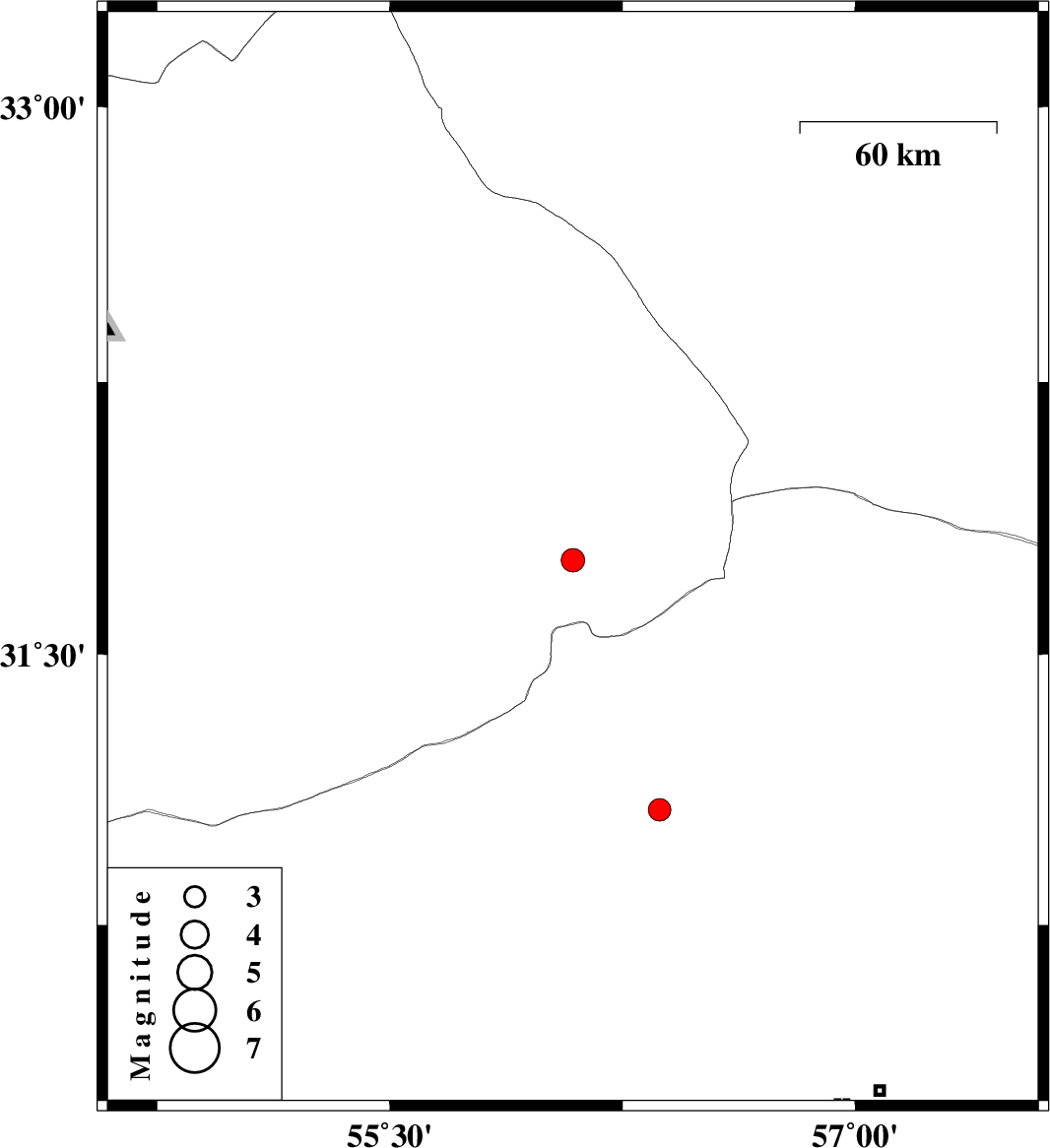 2009/10/14 | 01:46:30.8 | 05:16:30.8 | 31.07 | 56.37 | 18 | ML:3.2 | Kerman Province, 34 km North-West of Zarand |