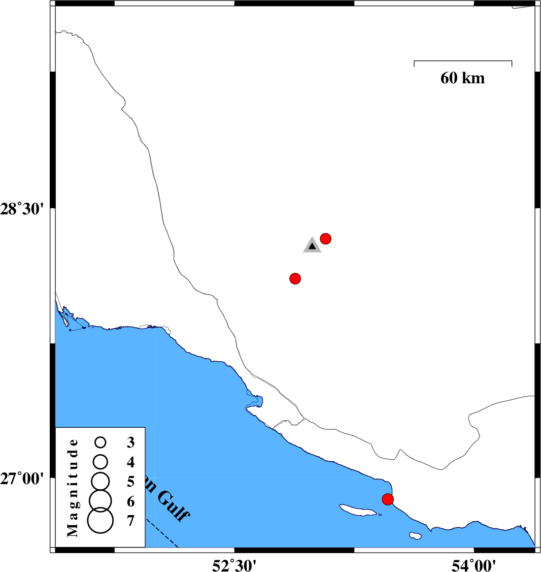 2009/11/18 | 06:35:58.4 | 10:05:58.4 | 26.88 | 53.46 | 36 | ML:3.2 | Persian Gulf, 58 km South-East of Lamerd | ||