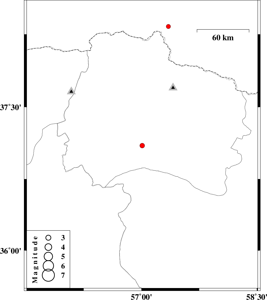 2009/11/29 | 11:38:26.1 | 15:08:26.1 | 37.1 | 57.01 | 24 | ML:2.8 | Khorasan(north) Province, 43 km West of Esfarayen | ||