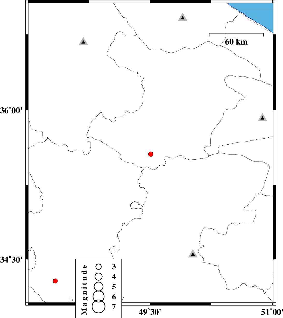 2009/12/05 | 04:23:44.9 | 07:53:44.9 | 35.56 | 49.51 | 14 | ML:2.7 | Ghazvin Province, 47 km North-East of Razan | ||