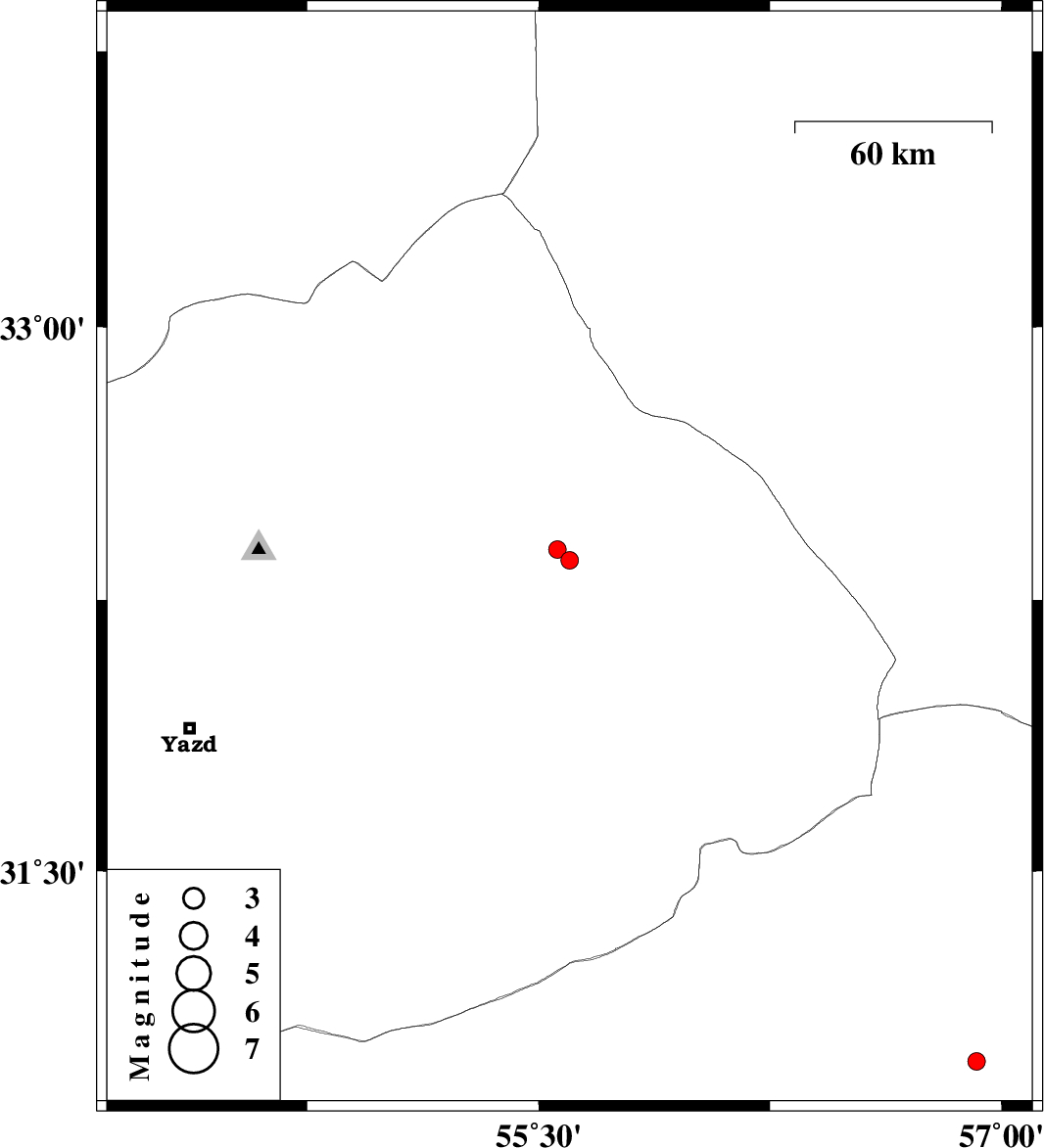 2009/12/28 | 09:53:34.5 | 13:23:34.5 | 32.36 | 55.6 | 14 | ML:2.5 | Yazd Province, 86 km North-East of Bafq | ||