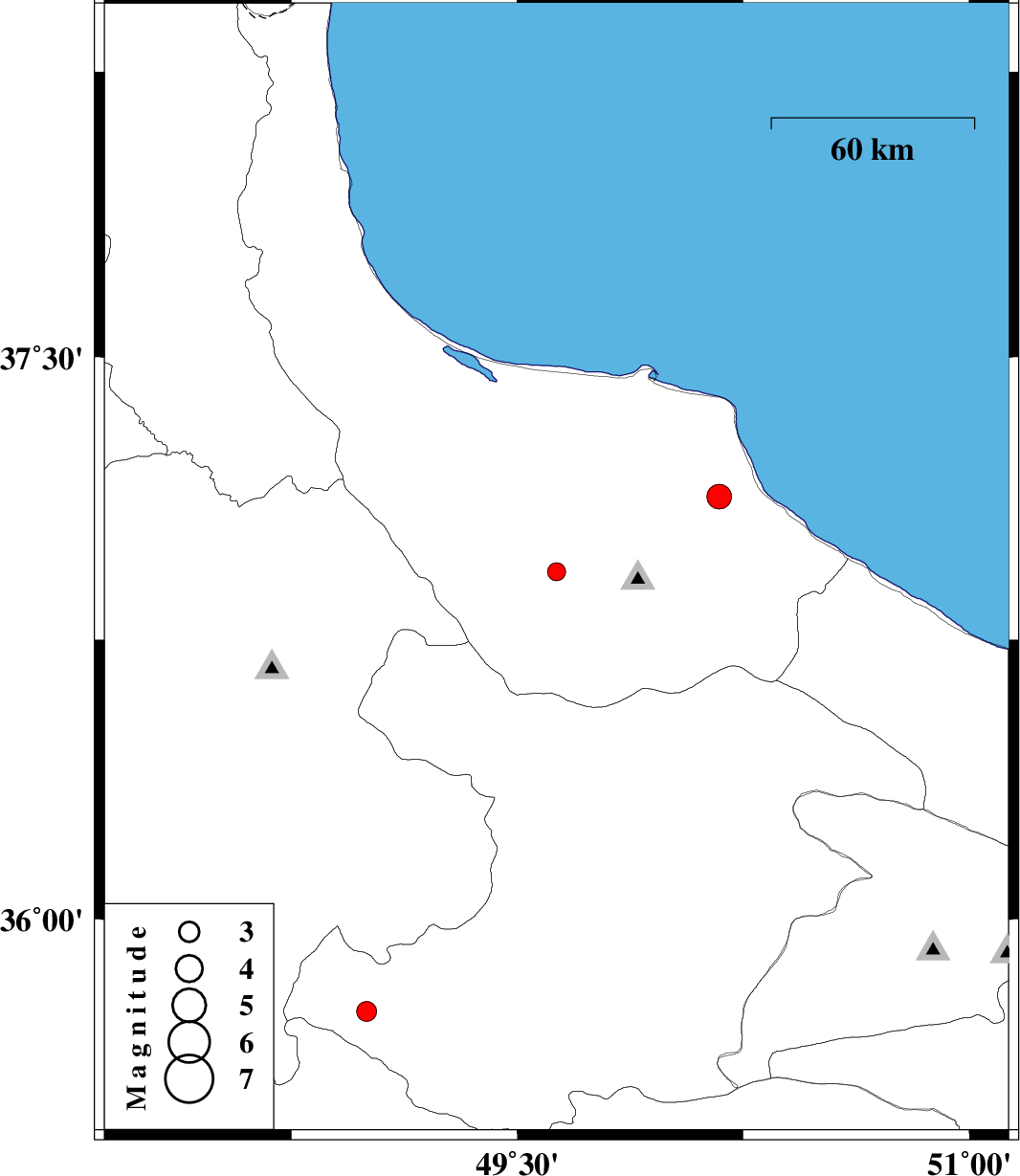 2010/04/11 | 10:13:59.9 | 14:43:59.9 | 36.93 | 49.63 | 34 | ML:2.7 | Gilan Province, 21 km North-East of Rudbar | ||
