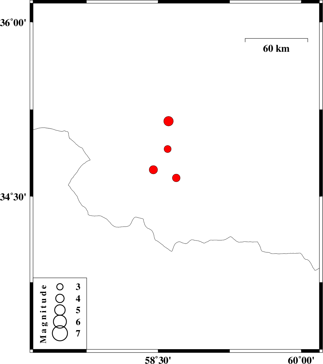 2010/04/12 | 08:29:04.2 | 12:59:04.2 | 34.73 | 58.45 | 41 | ML:4 | Khorasan(center) Province, 56 km South of Kashmar |