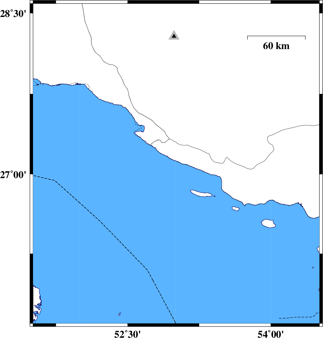 2010/05/10 | 03:41:22.4 | 08:11:22.4 | 27.09 | 53.01 | 15 | ML:3.3 | Persian Gulf, 31 km South-West of Lamerd | ||