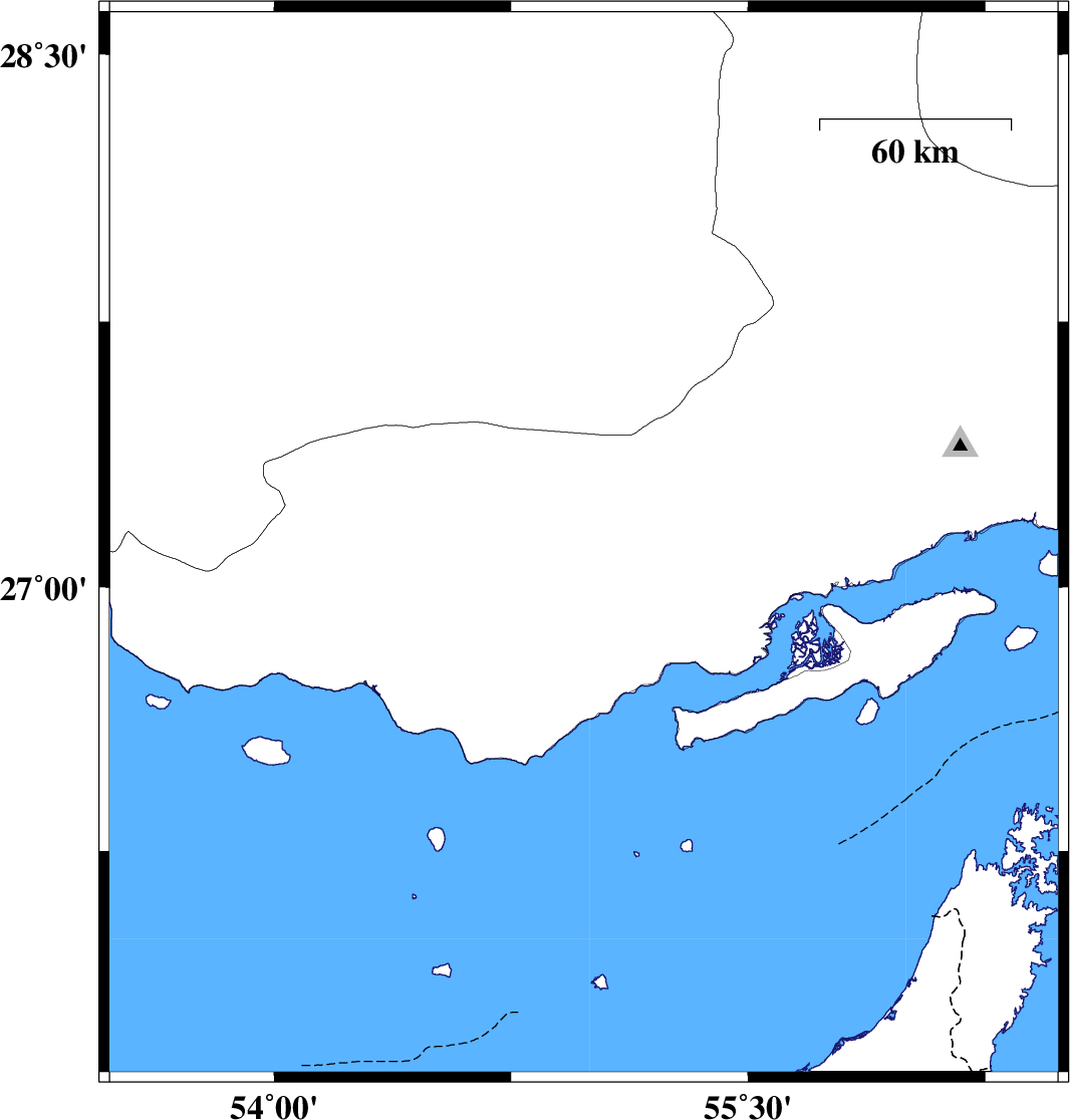 2010/05/06 | 15:07:11.3 | 19:37:11.3 | 26.77 | 53.86 | 16 | ML:3.8 | Hormozgan Province, 69 km South-West of Bastak | ||