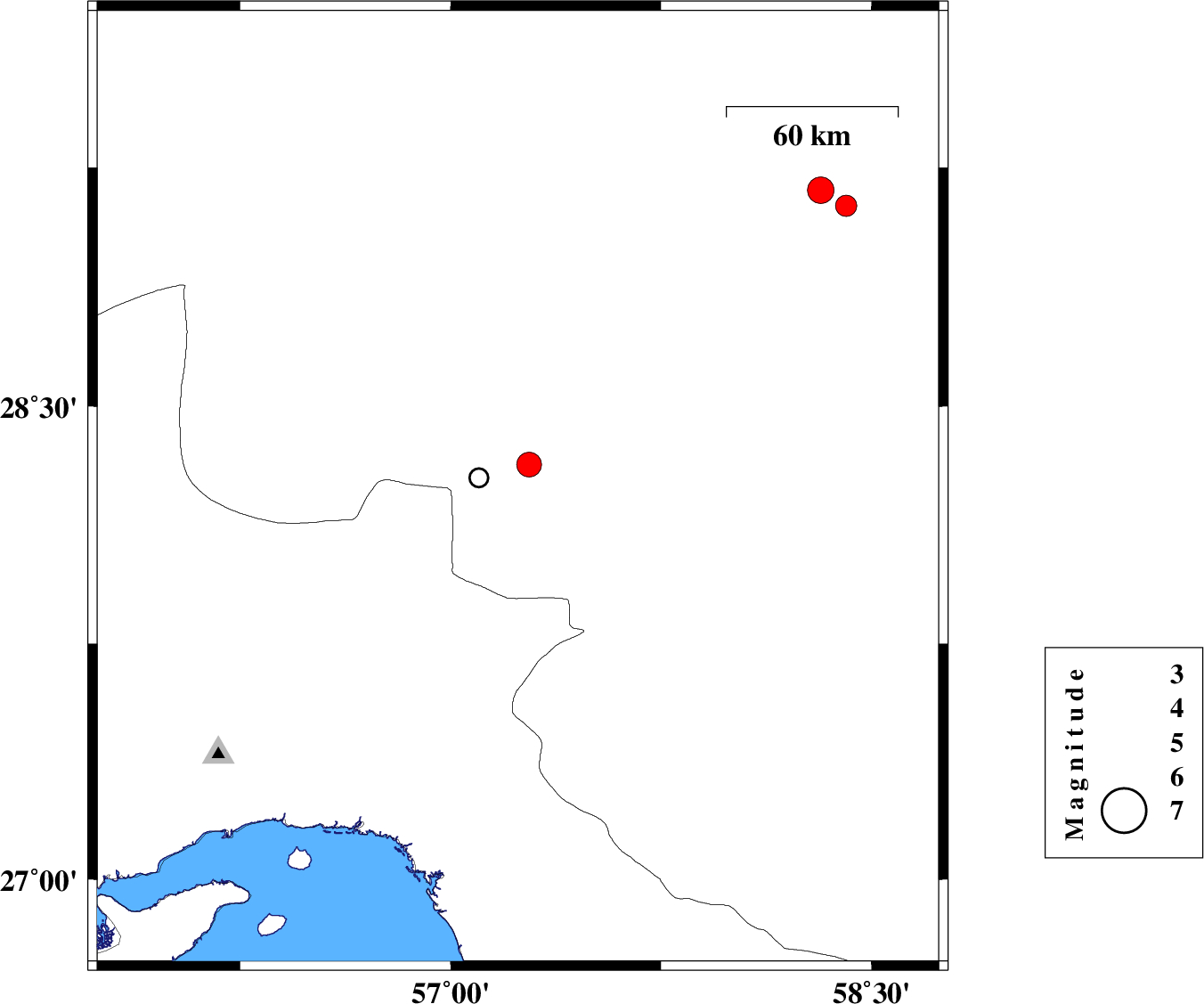 2010/05/20 | 12:38:26.6 | 17:08:26.6 | 28.19 | 57.33 | 45 | ML:3.4 | Kerman Province, 45 km North-West of Kahnuj | ||