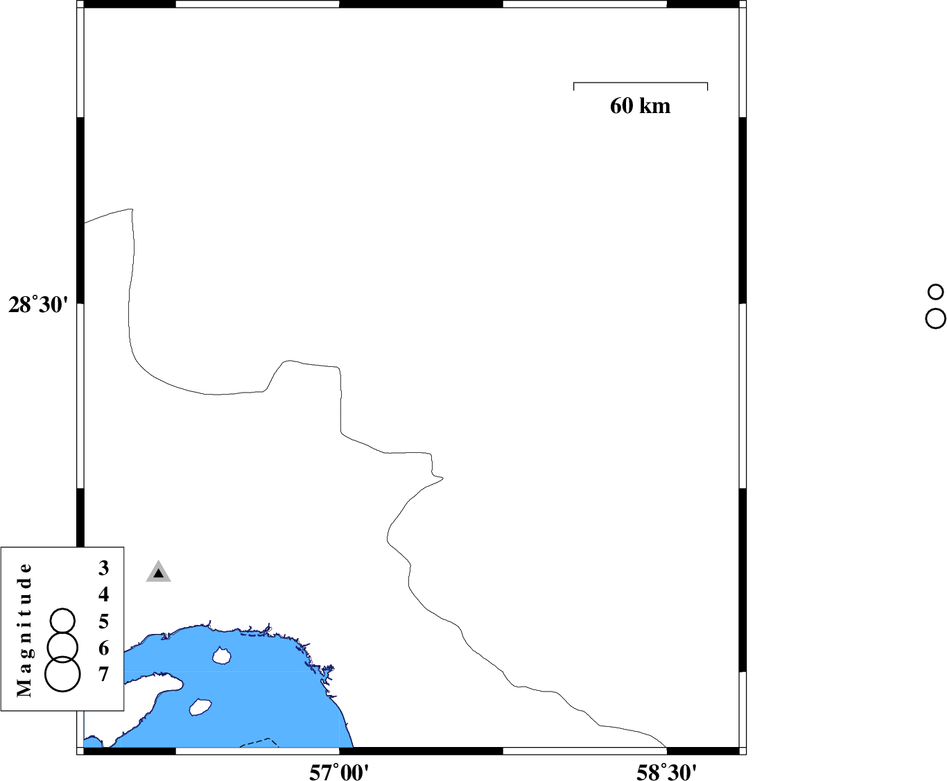 2010/05/20 | 12:38:26.6 | 17:08:26.6 | 28.19 | 57.33 | 45 | ML:3.4 | Kerman Province, 45 km North-West of Kahnuj | ||