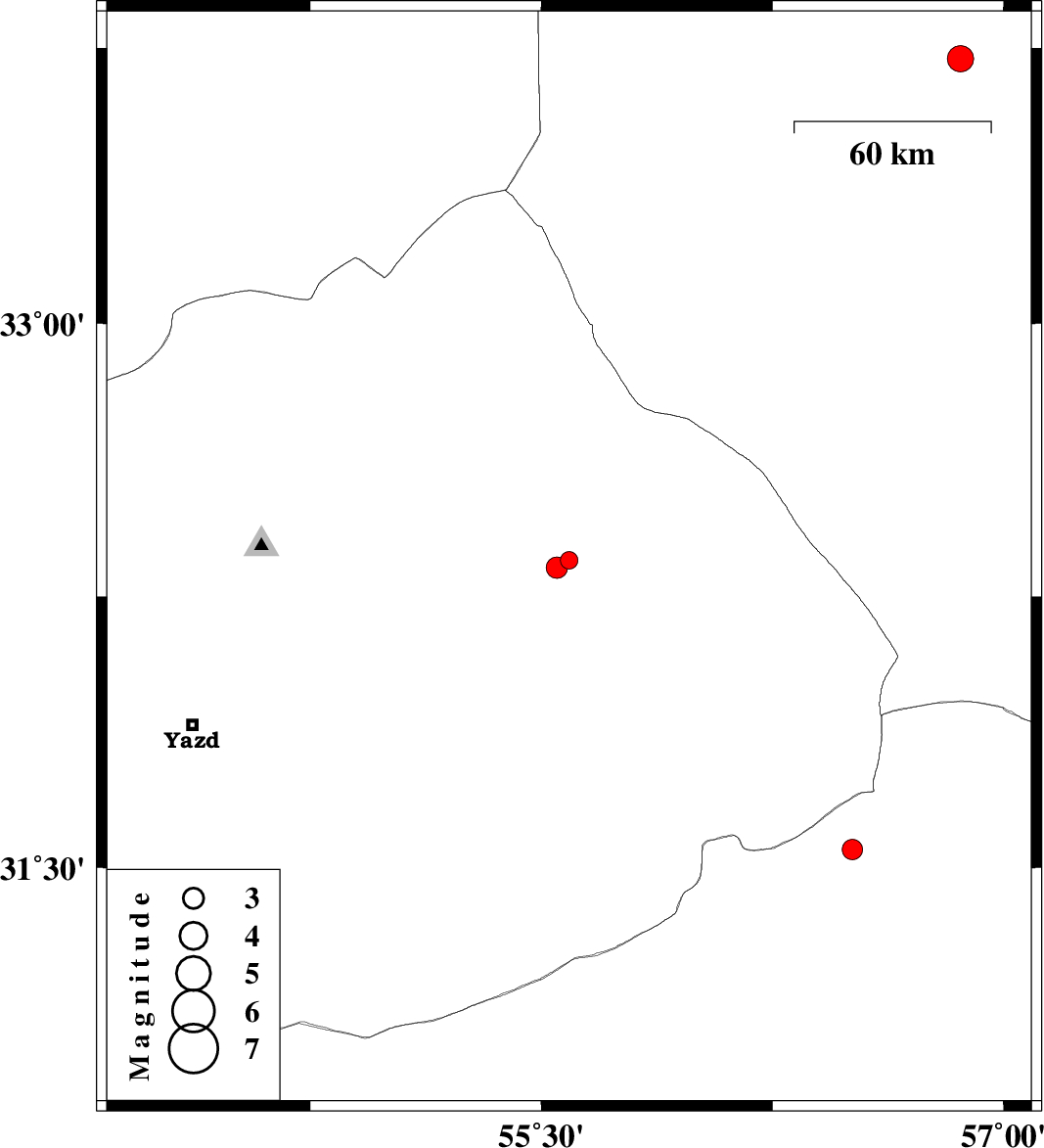 2010/04/29 | 13:40:21.5 | 18:10:21.5 | 32.33 | 55.55 | 41 | ML:3.1 | Yazd Province, 82 km North-East of Bafq |