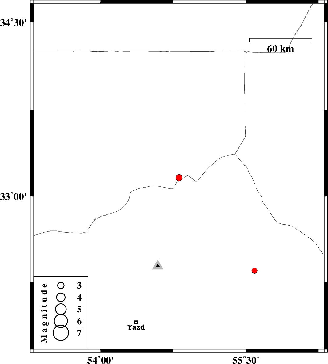 2010/05/27 | 08:57:30.9 | 13:27:30.9 | 32.35 | 55.59 | 15 | ML:2.6 | Yazd Province, 84 km North-East of Bafq |