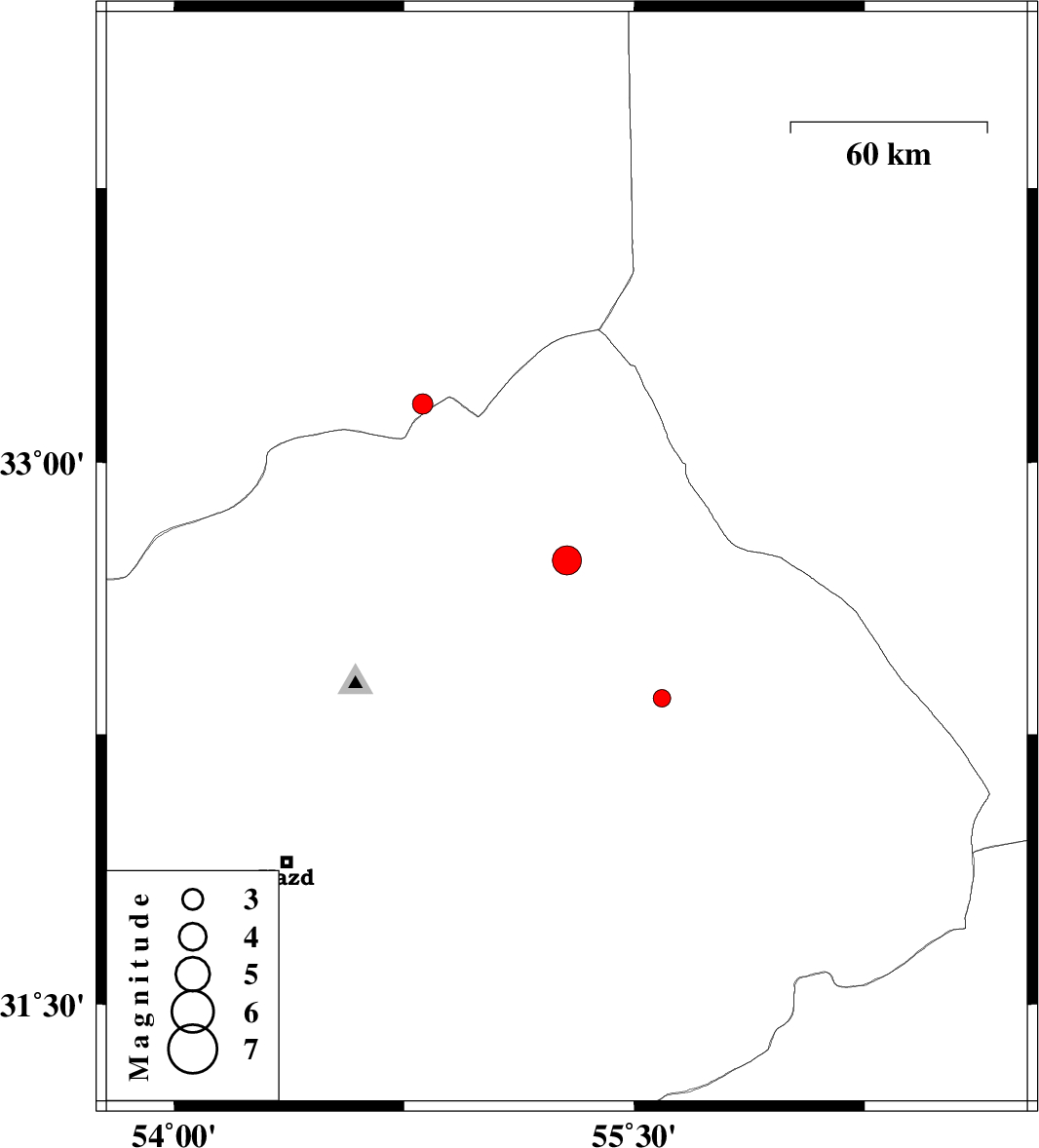 2010/05/30 | 11:12:47.6 | 15:42:47.6 | 32.73 | 55.28 | 14 | ML:4.2 | Yazd Province, 126 km North-West of Bafq | ||