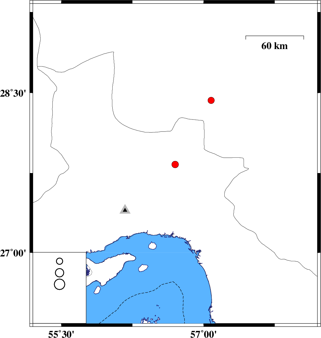 2010/06/30 | 04:13:59.7 | 08:43:59.7 | 27.83 | 56.7 | 14 | ML:3.3 | Hormozgan Province, 70 km North-West of Dehbarez | ||