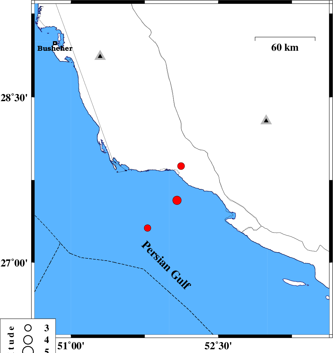2010/07/03 | 08:50:40.3 | 13:20:40.3 | 27.84 | 52.13 | 14 | ML:3.1 | Bushehr Province, 7 km Bandar-e kangan | ||
