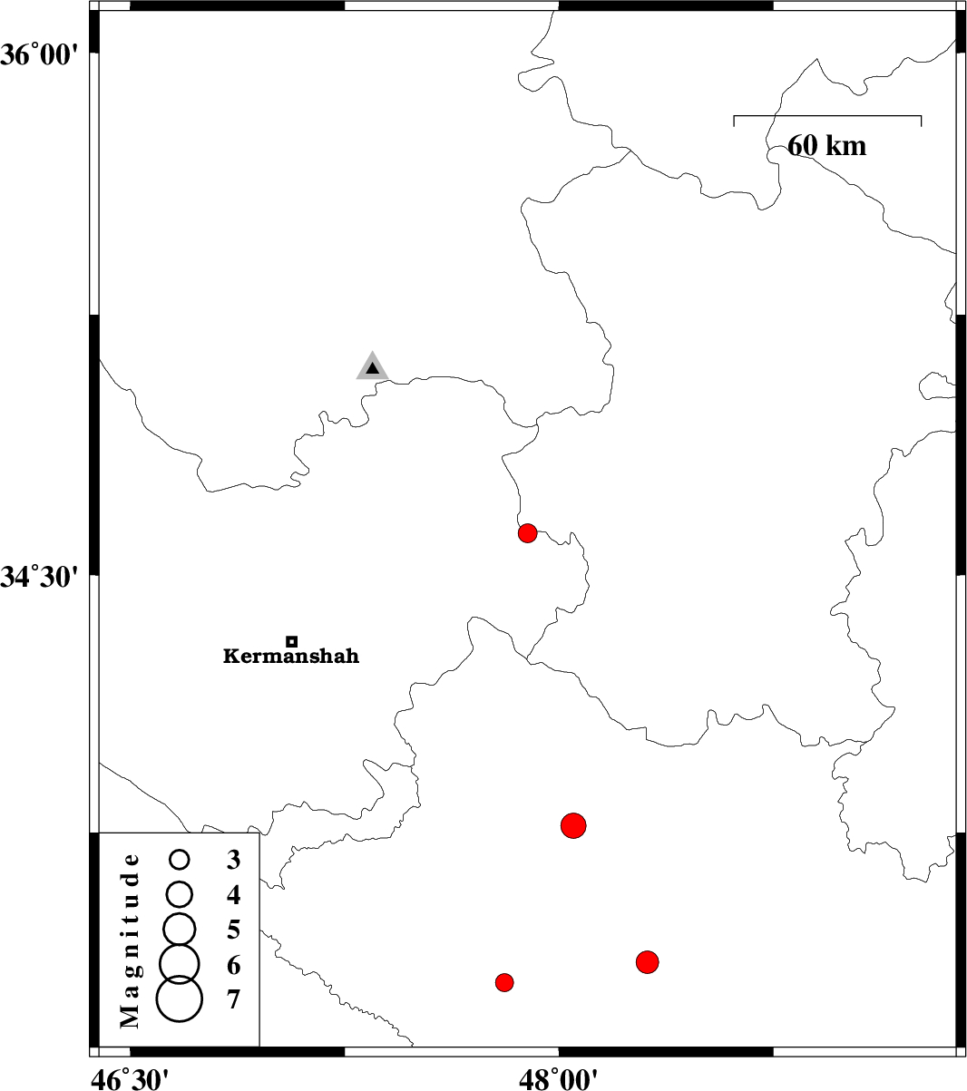 2010/08/13 | 22:48:37.0 | 03:18:37.0 | 34.62 | 47.89 | 14 | ML:2.9 | Kermanshah Province, 15 km North of Kangavar | ||
