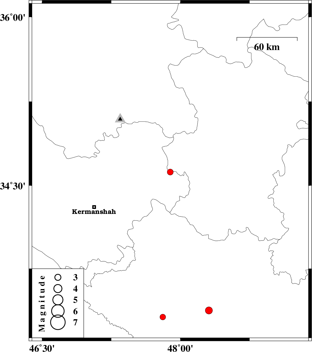 2010/08/13 | 22:48:37.0 | 03:18:37.0 | 34.62 | 47.89 | 14 | ML:2.9 | Kermanshah Province, 15 km North of Kangavar | ||