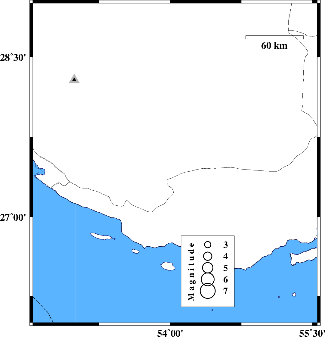 2010/09/18 | 23:07:29.4 | 03:37:29.4 | 27.96 | 54 | 15 | ML:2.7 | Fars Province, 46 km North-West of Lar |