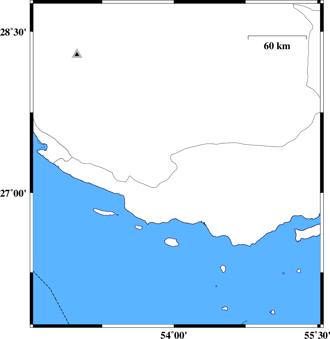 | 2010/10/06 | 19:27:44.1 | 22:57:44.1 | 27.26 | 54.03 | 26 | ML:2.9 | Hormozgan Province, 34 km West of Bastak | ||