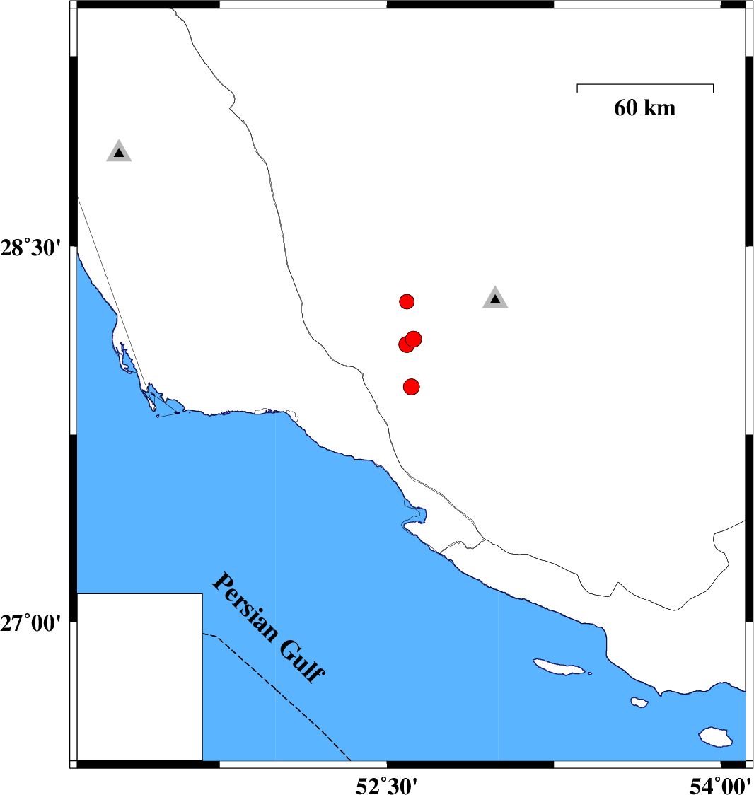 | 2010/11/30 | 16:01:42.0 | 19:31:42.0 | 28.11 | 52.59 | 14 | ML:3.2 | Fars Province, 41 km North-East of Jam |