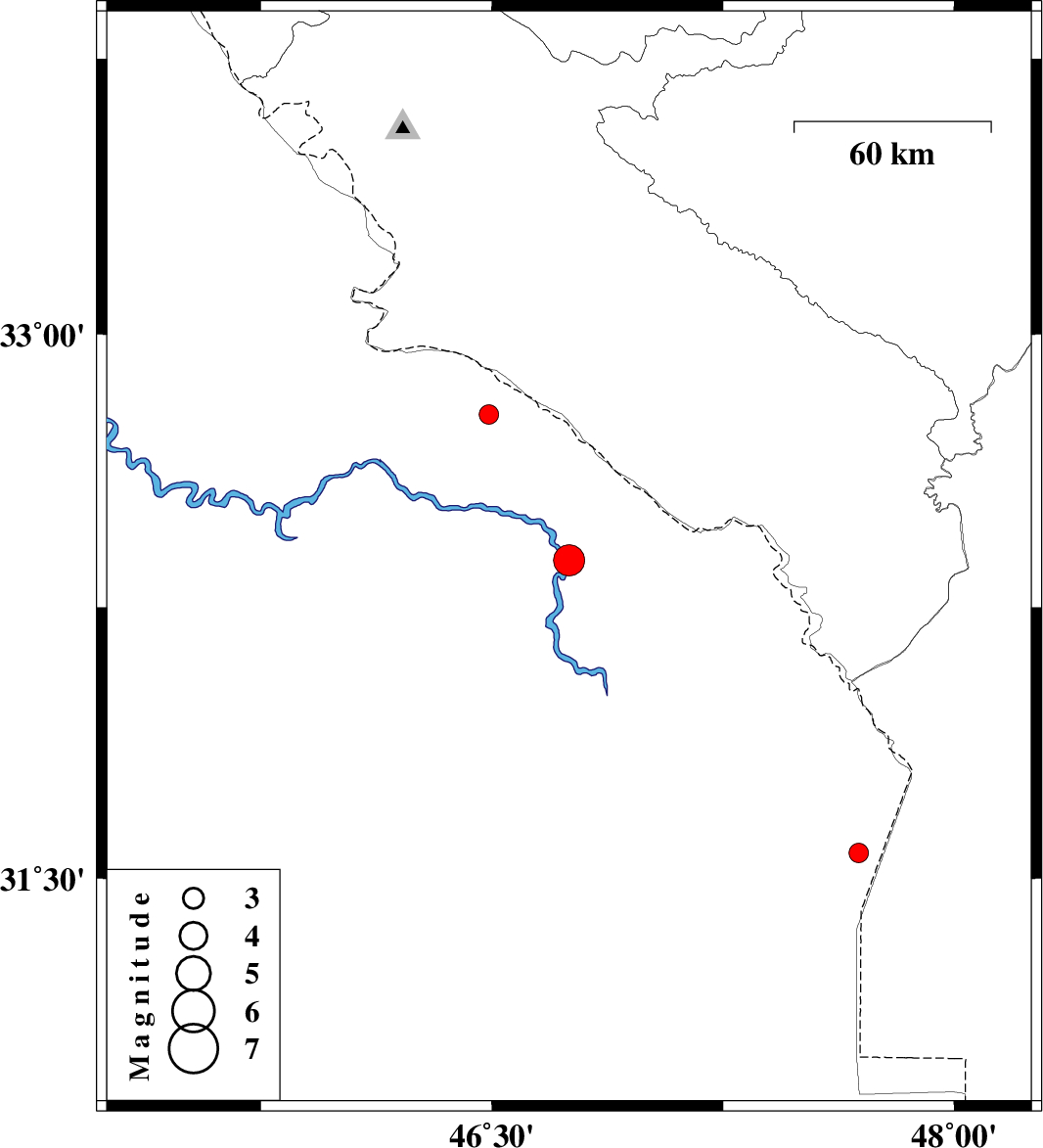 | 2012/02/23 | 15:54:18.0 | 19:24:18.0 | 31.57 | 47.69 | 41 | ML:2.8 | Iraq, 47 km West of Susangerd |