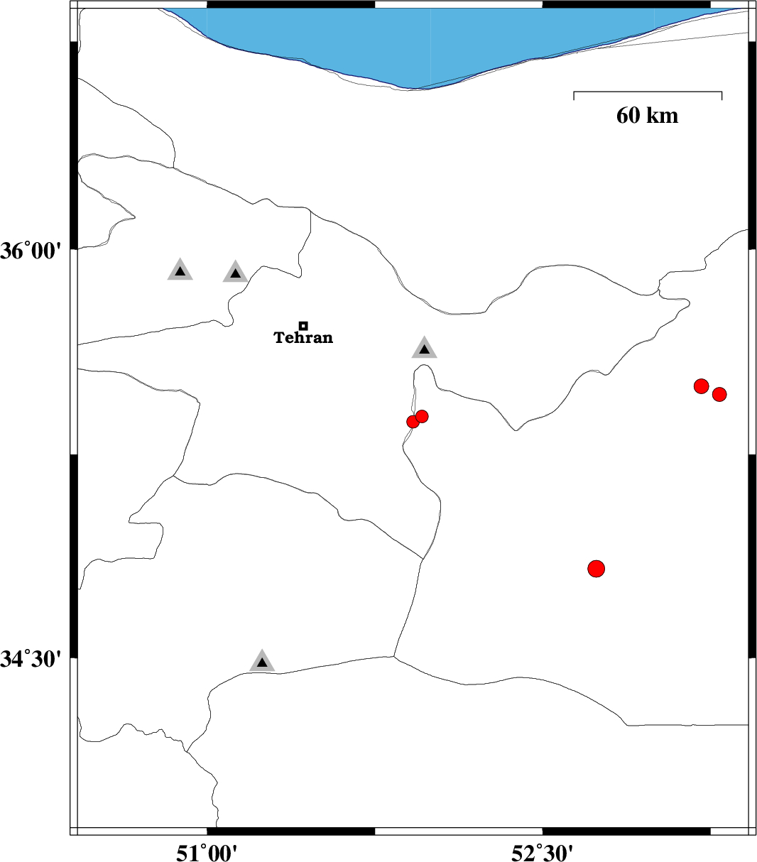 | 2012/05/18 | 07:13:54.9 | 11:43:54.9 | 34.83 | 52.74 | 17 | ML:3.4 | Semnan Province, 57 km South-East of Garmsar | ||