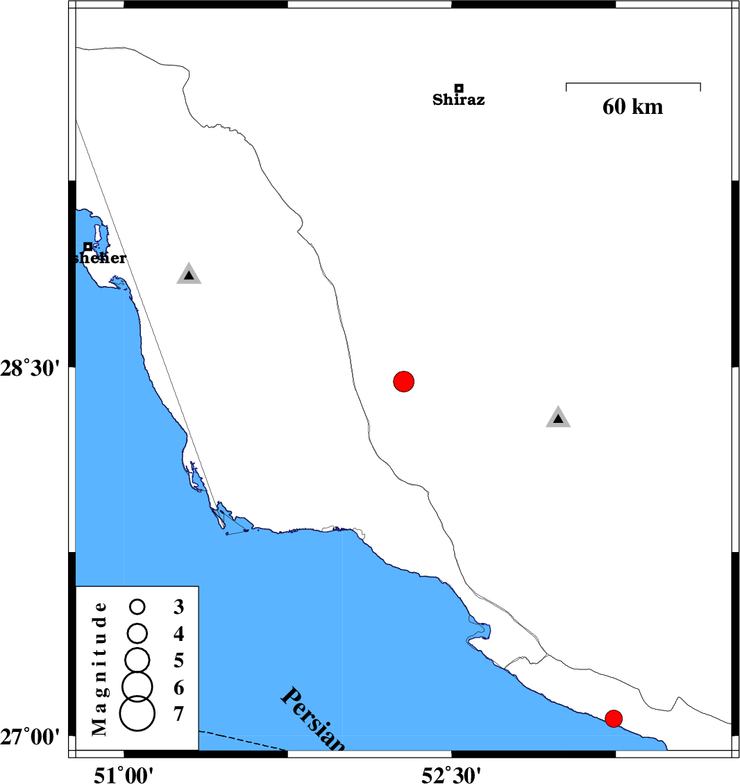 | 2012/05/30 | 06:55:44.7 | 11:25:44.7 | 28.44 | 52.28 | 37 | ML:4.3 | Fars Province, 51 km South-East of Farashband | ||