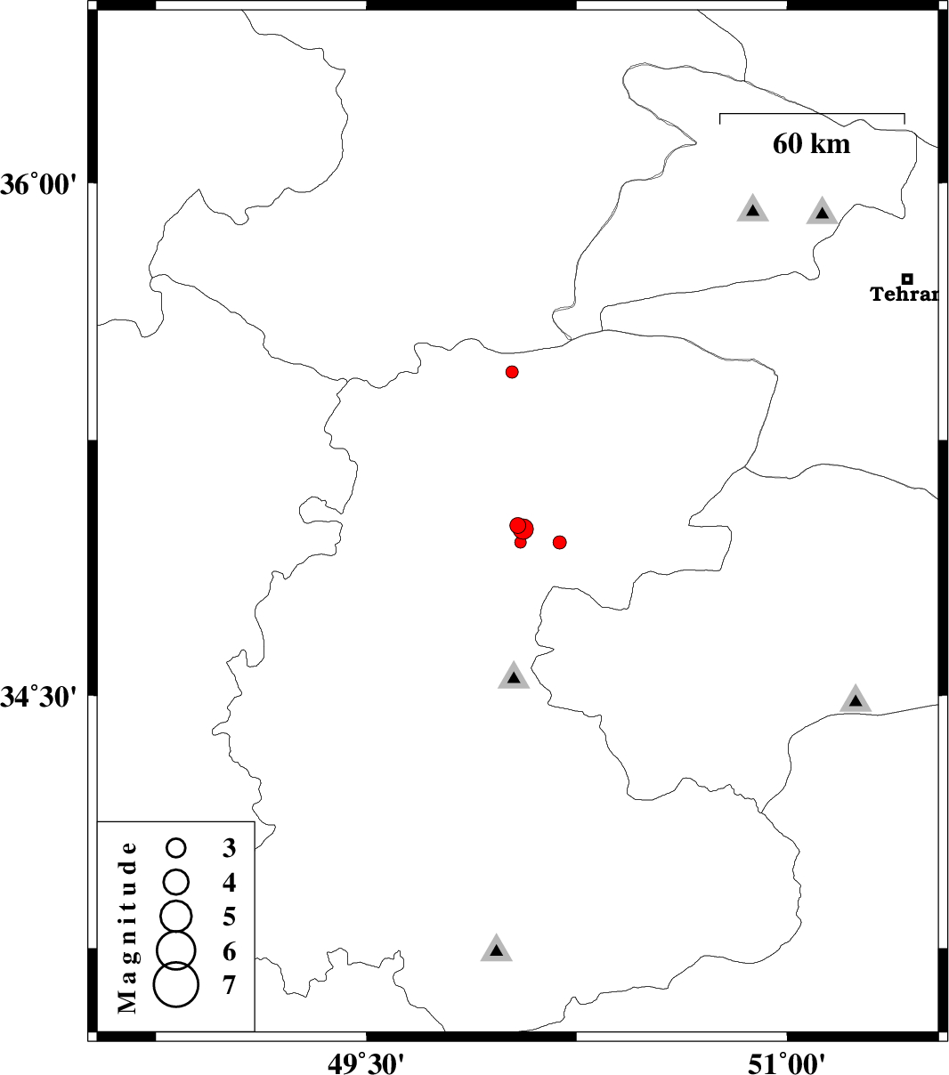 | 2012/06/06 | 11:24:41.1 | 15:54:41.1 | 35.45 | 50.02 | 46 | ML:2 | Markazi Province, 36 km South of Buinzara |
