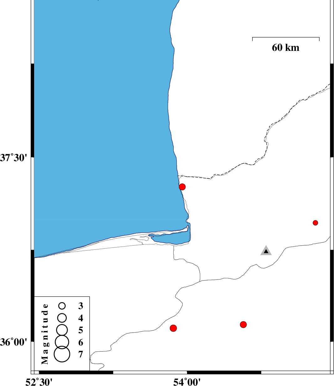 | 2012/07/04 | 07:30:31.8 | 12:00:31.8 | 37.26 | 53.95 | 14 | ML:3 | Golestan Province, 42 km North-West of Bandar-e torkaman | ||