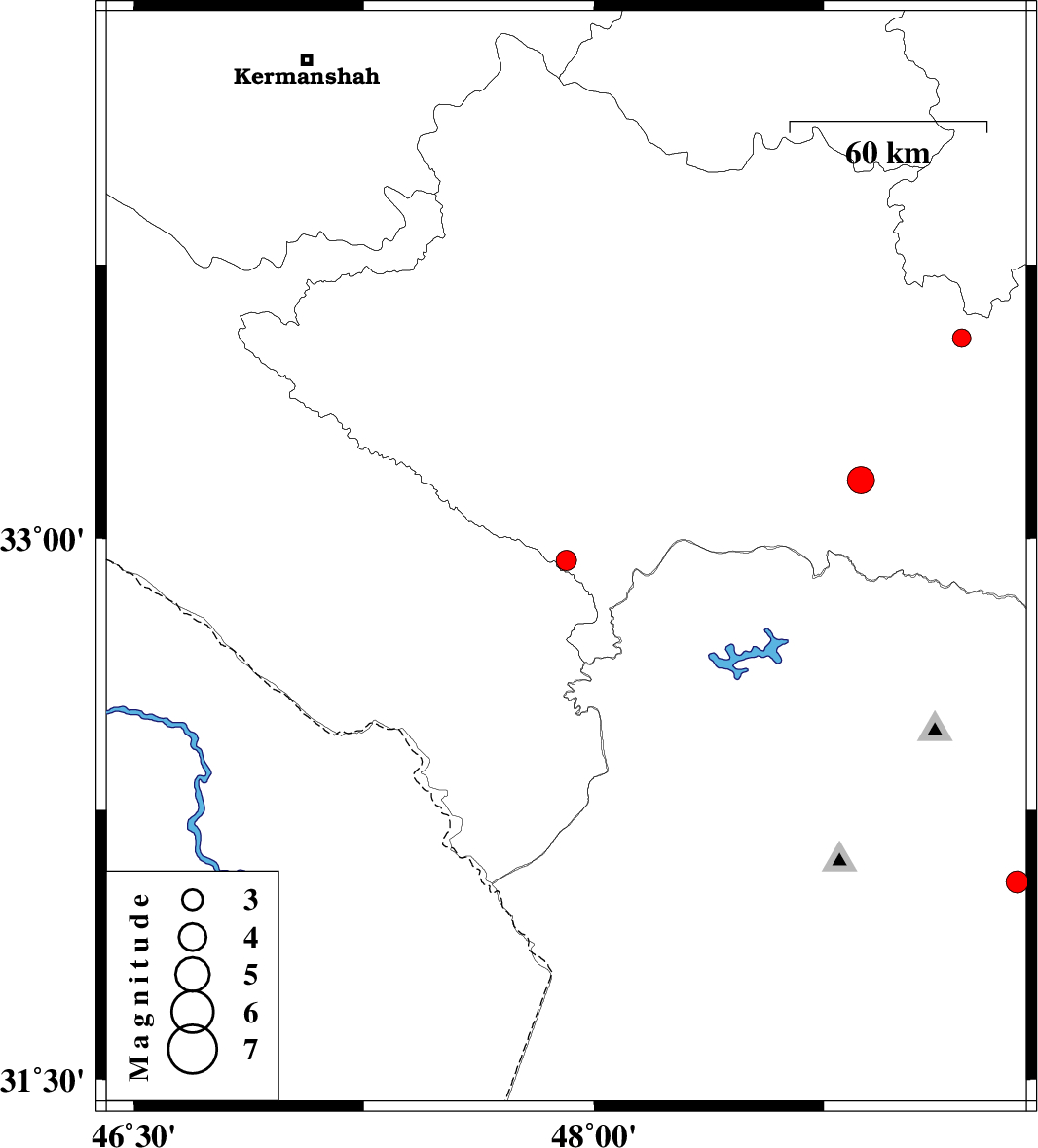 | 2012/07/24 | 16:22:39.5 | 20:52:39.5 | 32.94 | 47.91 | 14 | ML:3 | Lorestan Province, 30 km South-East of Pol-e dokhtar | ||