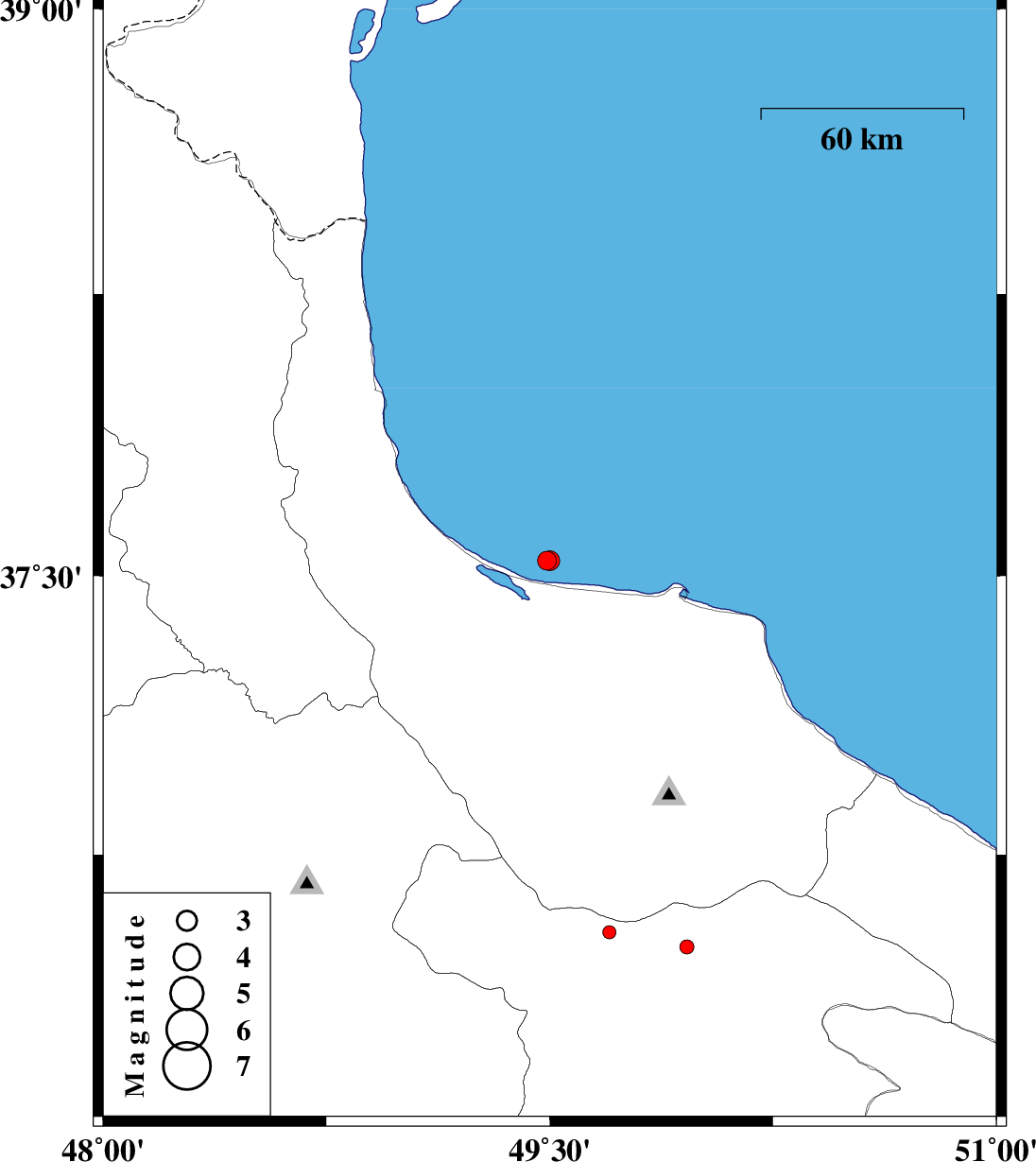 | 2012/07/29 | 04:56:14.9 | 09:26:14.9 | 37.54 | 49.49 | 14 | ML:2.8 | Caspian Sea, 7 km Bandar-e anzali | ||