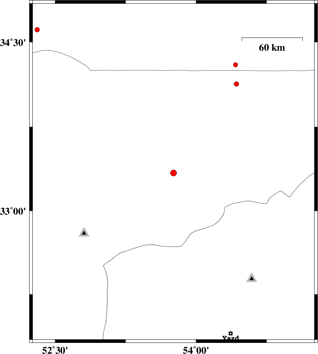 | 2012/07/31 | 18:30:27.1 | 23:00:27.1 | 33.34 | 53.76 | 18 | ML:3 | Esfahan Province, 81 km North-East of Nain | ||