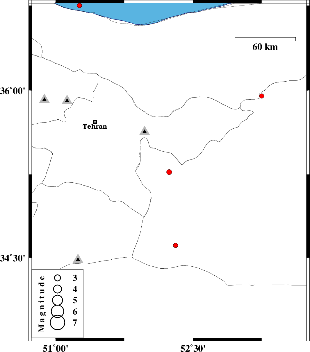 | 2012/08/03 | 14:44:32.6 | 19:14:32.6 | 35.27 | 52.24 | 14 | ML:2.6 | Semnan Province, 10 km Garmsar | ||