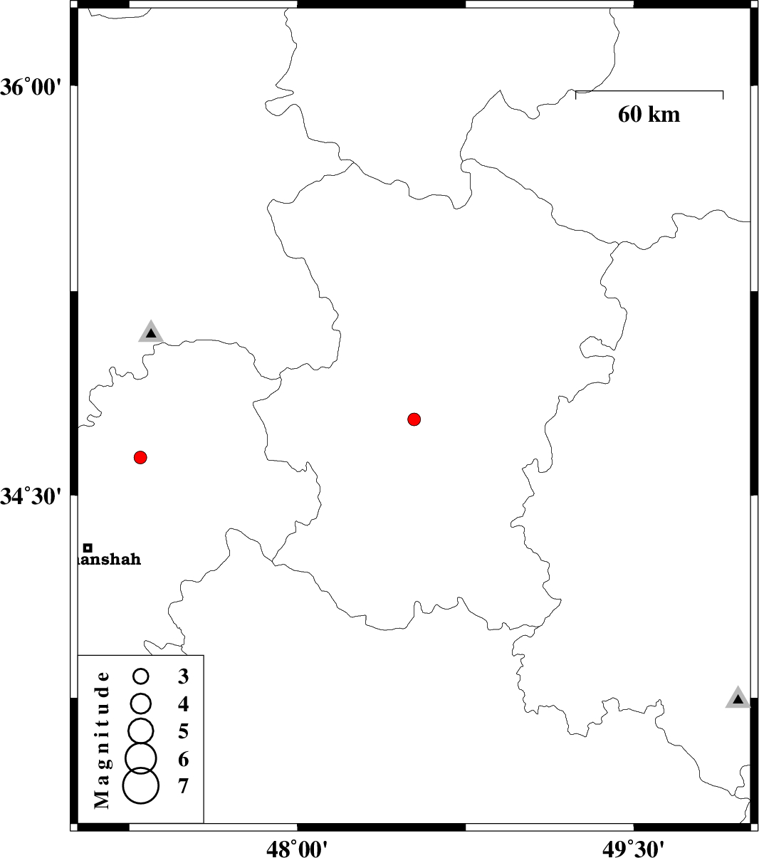 | 2012/08/09 | 21:22:40.1 | 01:52:40.1 | 34.64 | 47.3 | 31 | ML:2.6 | Kermanshah Province, 31 km South-West of Sonqor | ||