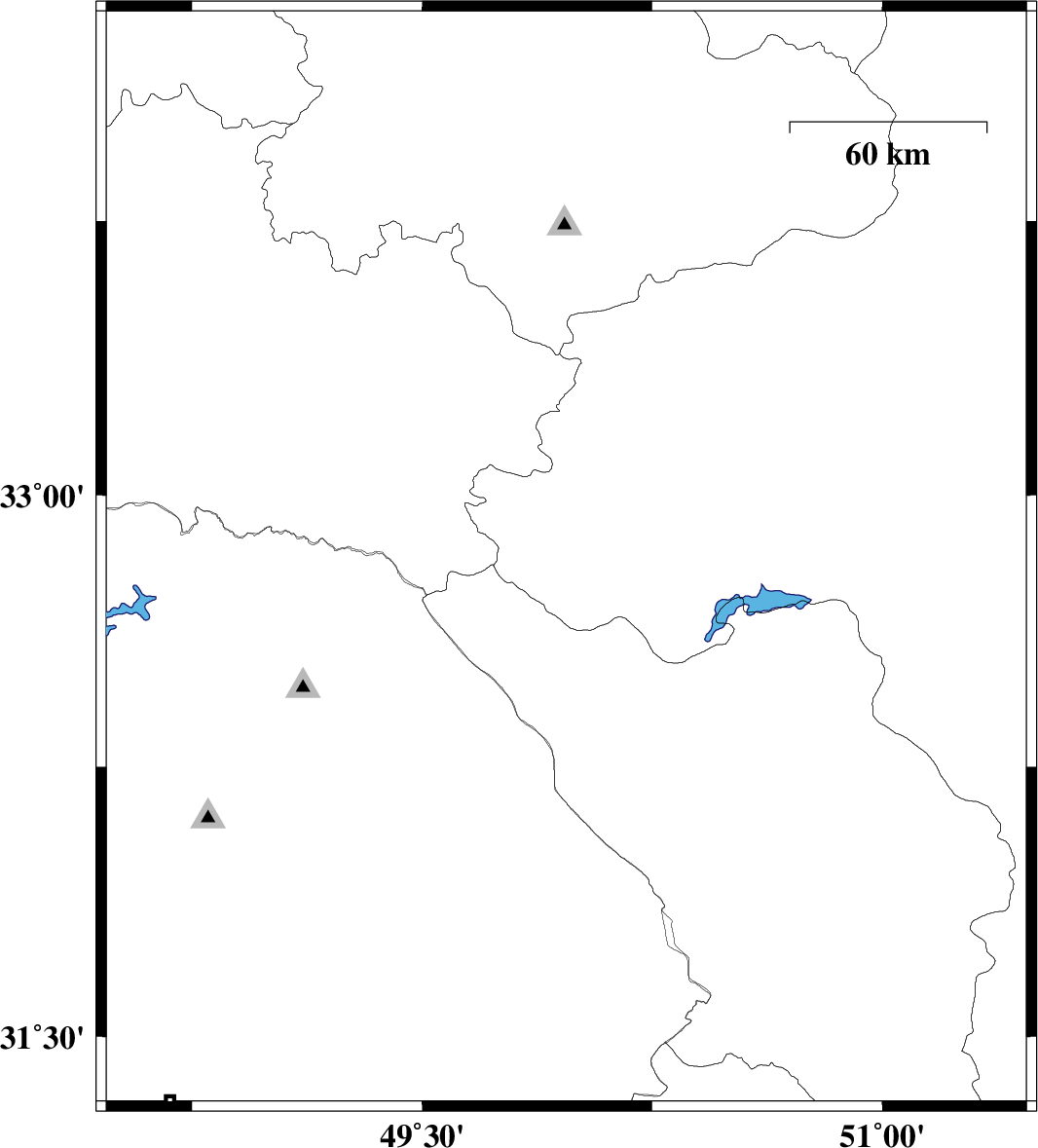 | 2012/08/22 | 06:44:01.7 | 11:14:01.7 | 32.82 | 49.97 | 14 | ML:2 | Esfahan Province, 19 km South-West of Fereydunshahr | ||