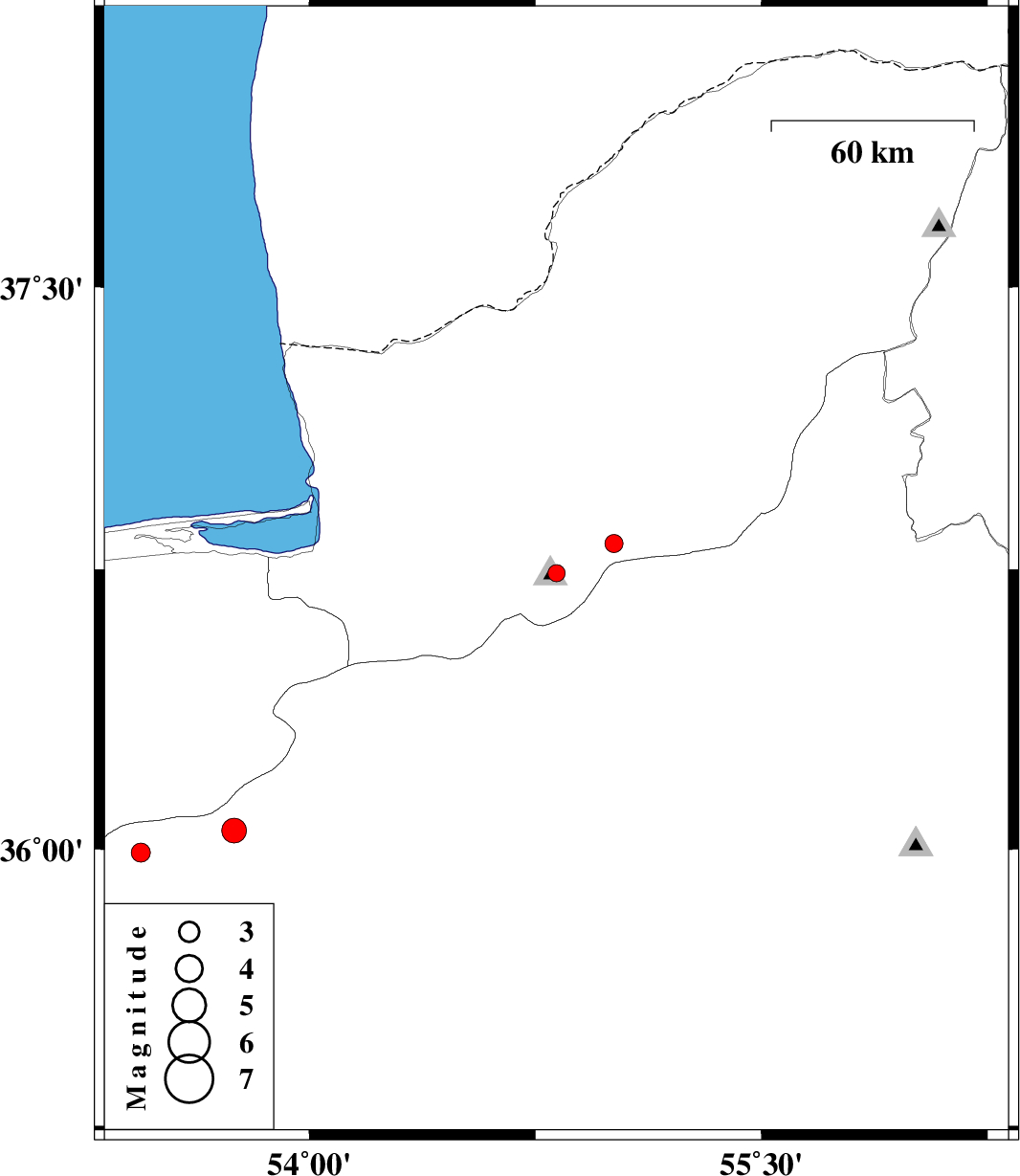| 2012/08/29 | 23:46:21.5 | 04:16:21.5 | 36.74 | 54.82 | 15 | ML:2.5 | Golestan Province, 18 km South of Ali Abad | ||