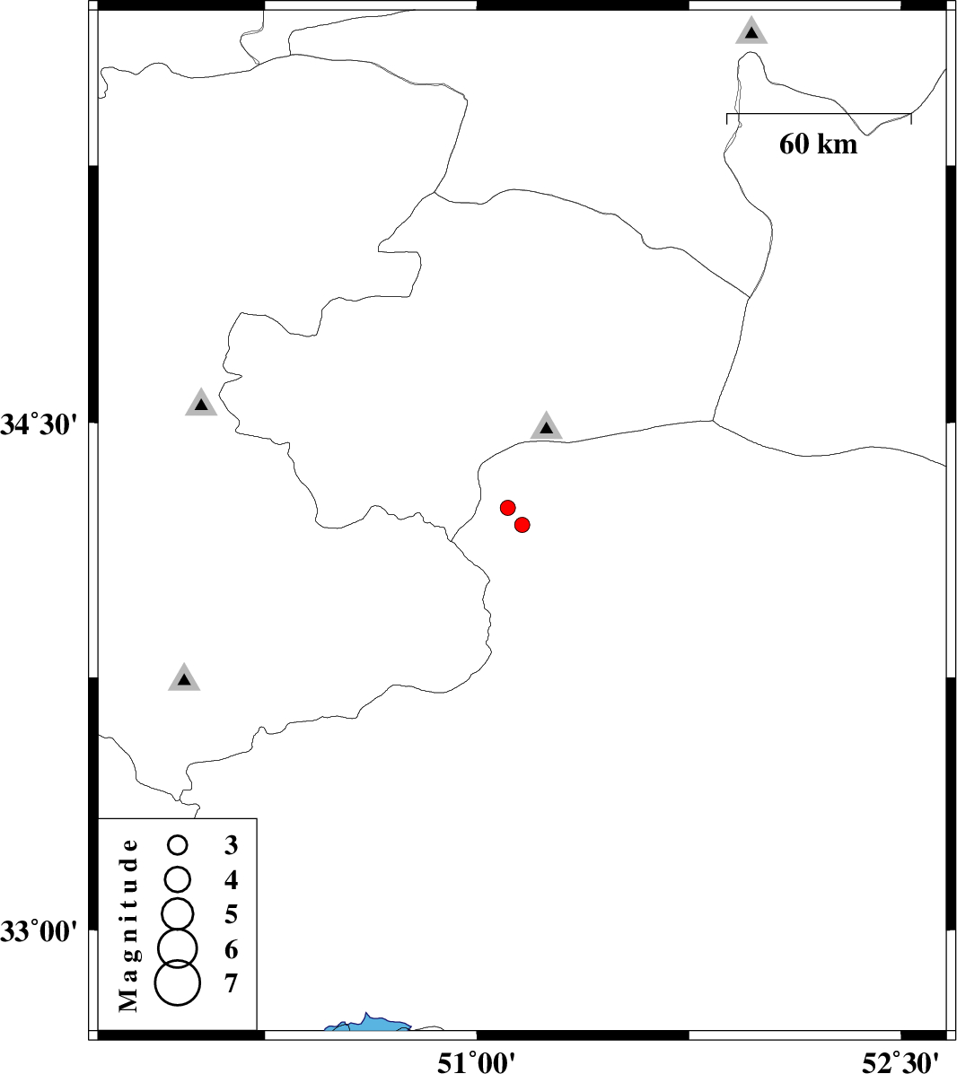 | 2012/09/03 | 01:43:13.1 | 06:13:13.1 | 34.2 | 51.16 | 24 | ML:2.4 | Esfahan Province, 32 km North-West of Aran va bidgol |