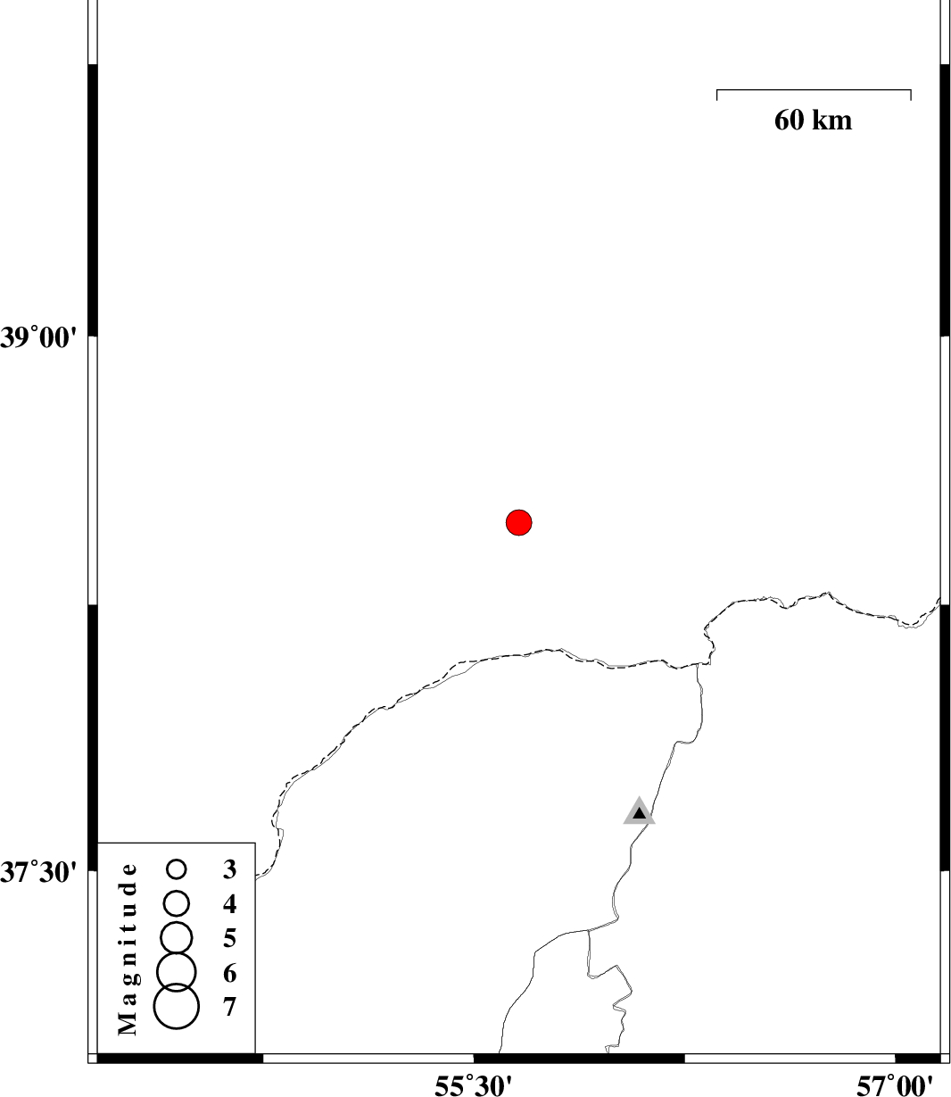 | 2012/09/04 | 00:18:59.4 | 04:48:59.4 | 37.27 | 54.48 | 26 | ML:3.1 | Golestan Province, 29 km North of Aq Qaleh | ||
