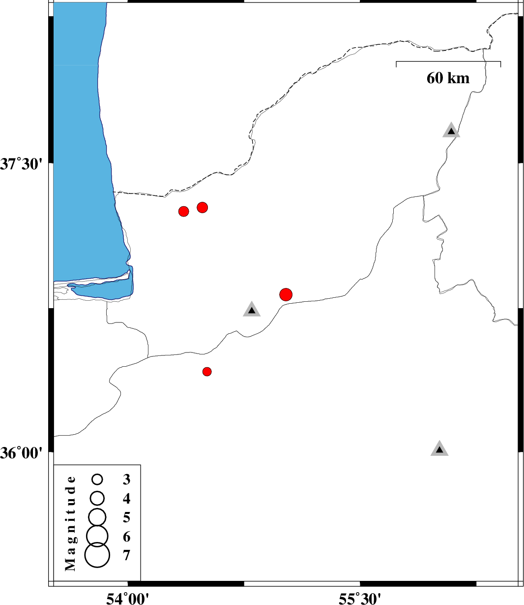| 2012/09/08 | 13:08:02.2 | 17:38:02.2 | 36.82 | 55.02 | 14 | ML:3.6 | Golestan Province, 16 km East of Ali Abad | ||