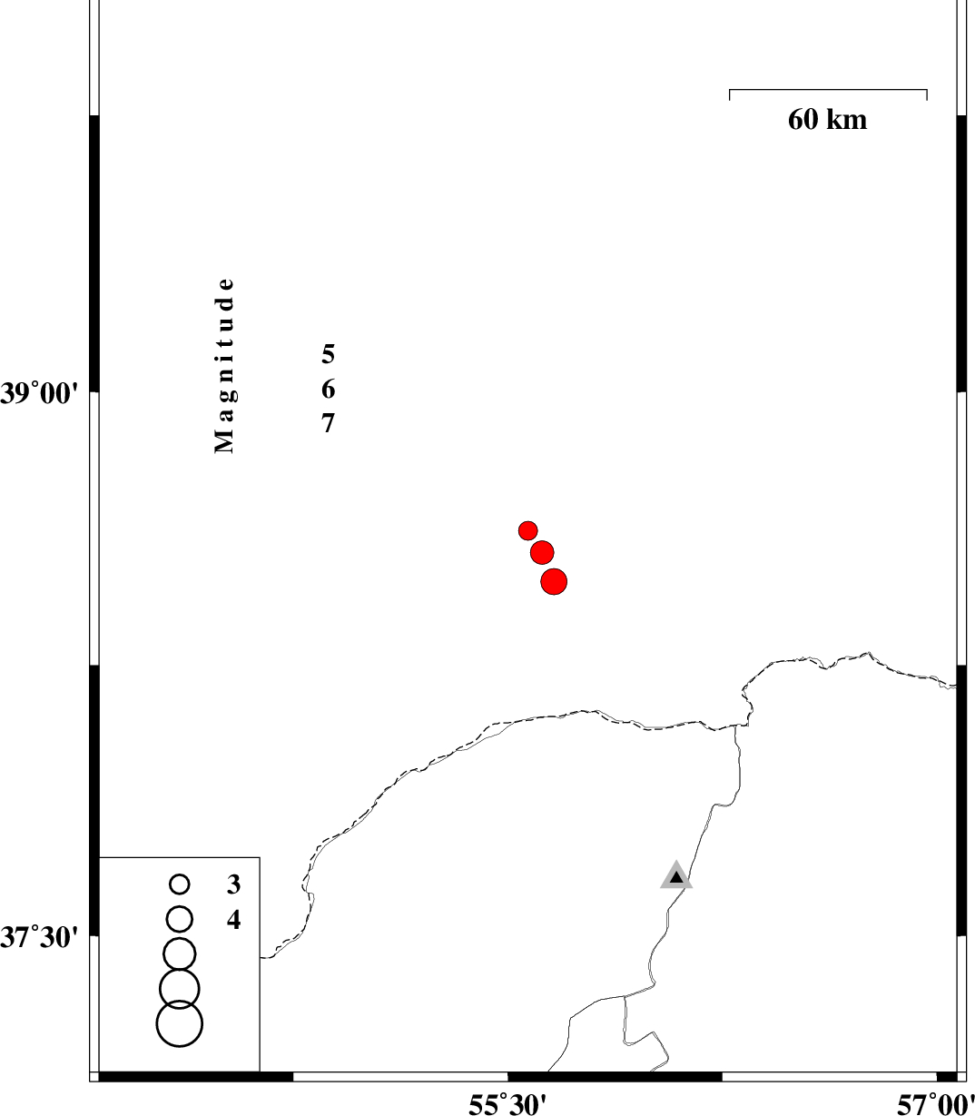 | 2012/09/04 | 00:18:59.4 | 04:48:59.4 | 37.27 | 54.48 | 26 | ML:3.1 | Golestan Province, 29 km North of Aq Qaleh | ||