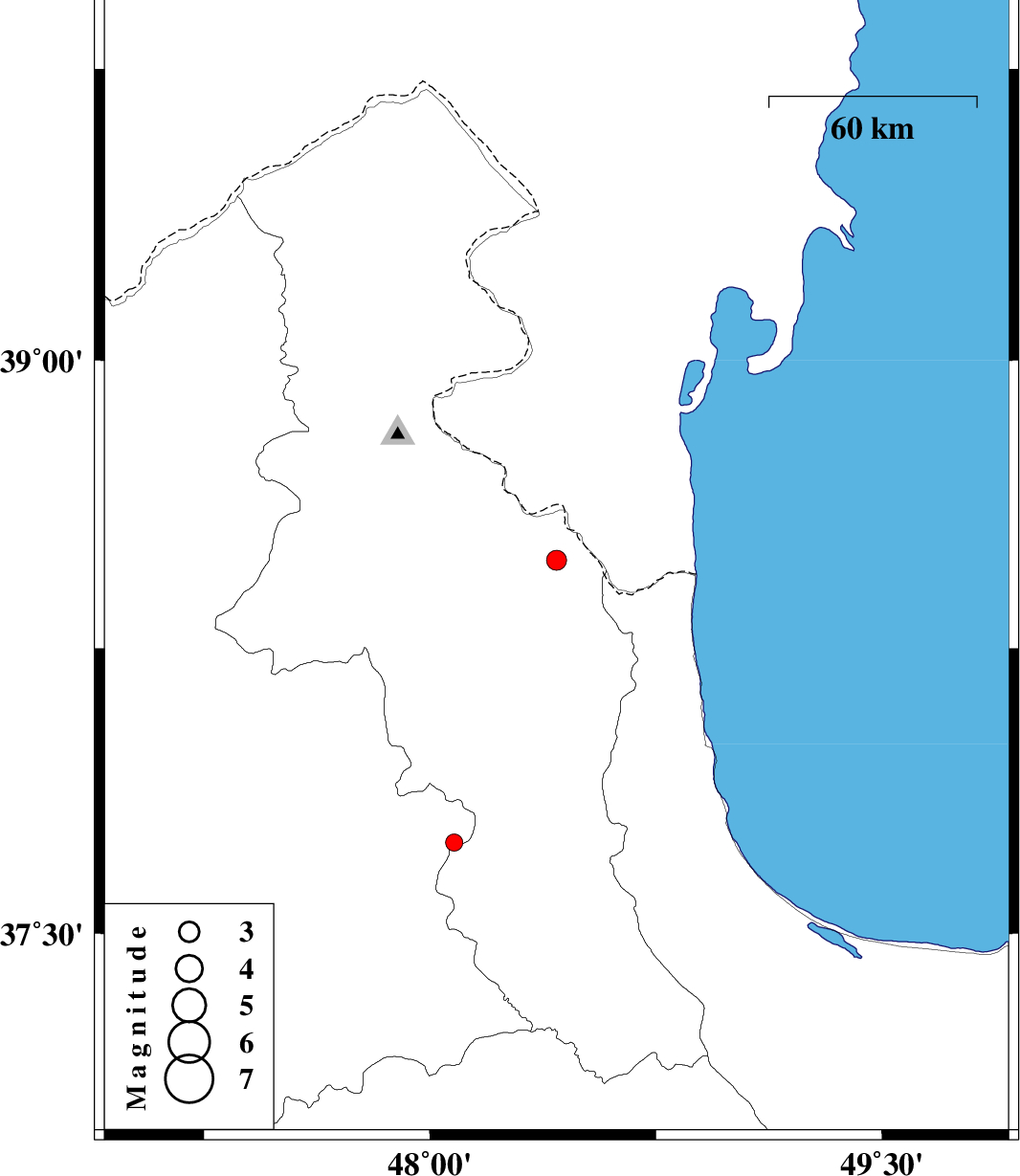 | 2012/09/06 | 18:47:01.1 | 23:17:01.1 | 37.74 | 48.08 | 18 | ML:2.5 | Azarbaijan Sharghi Province, 28 km West of Givi |