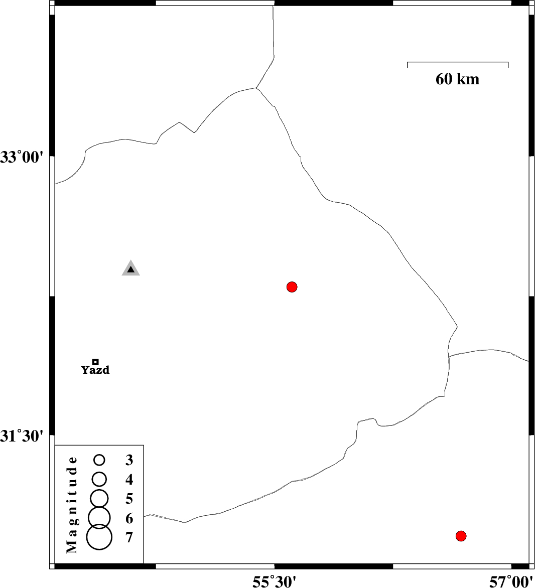 | 2012/10/05 | 03:16:23.1 | 06:46:23.1 | 30.95 | 56.68 | 15 | ML:3 | Kerman Province, 19 km North-East of Zarand |